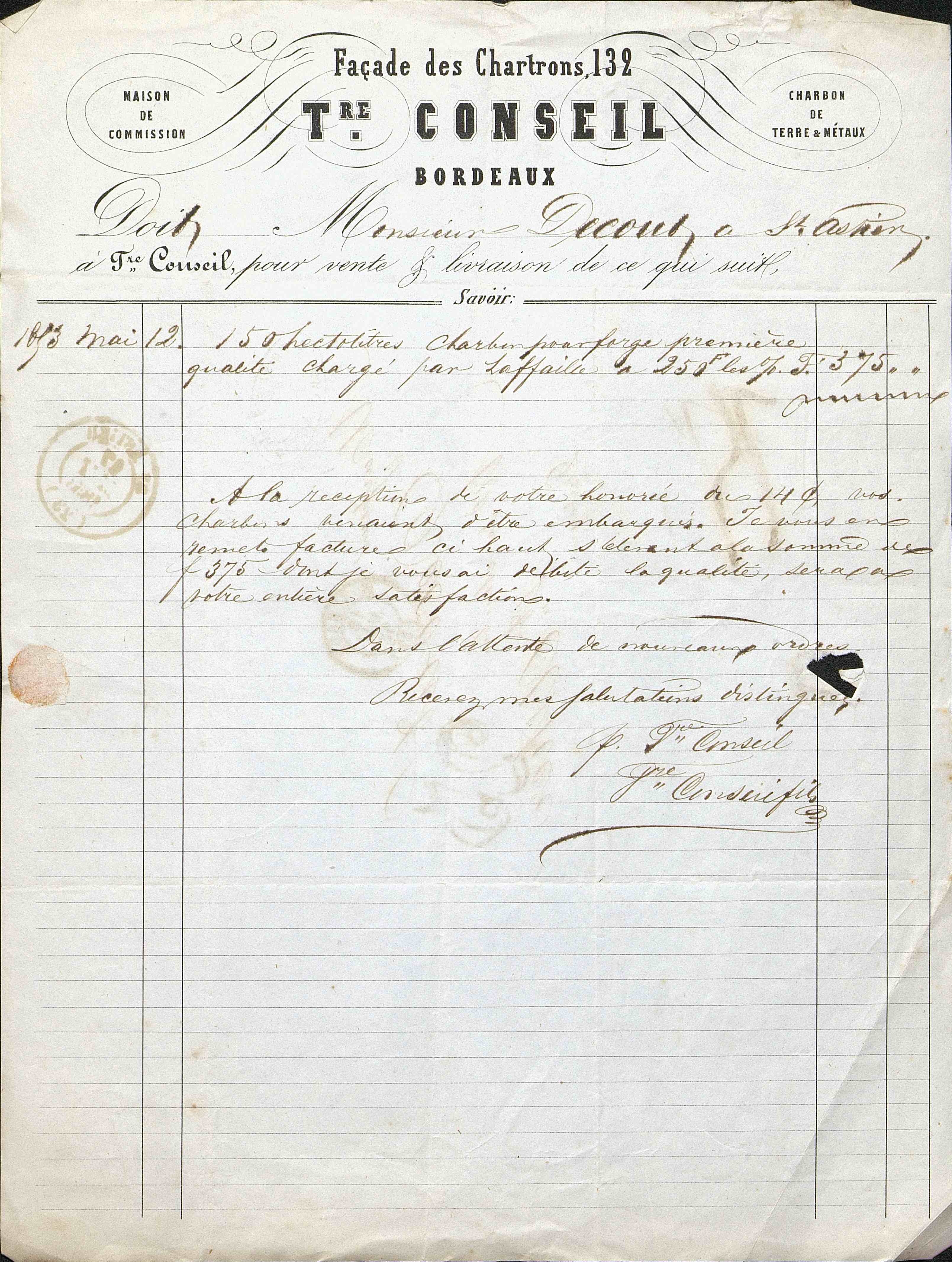 Facture de la Maison Conseil Bordeaux, négociant de charbons.