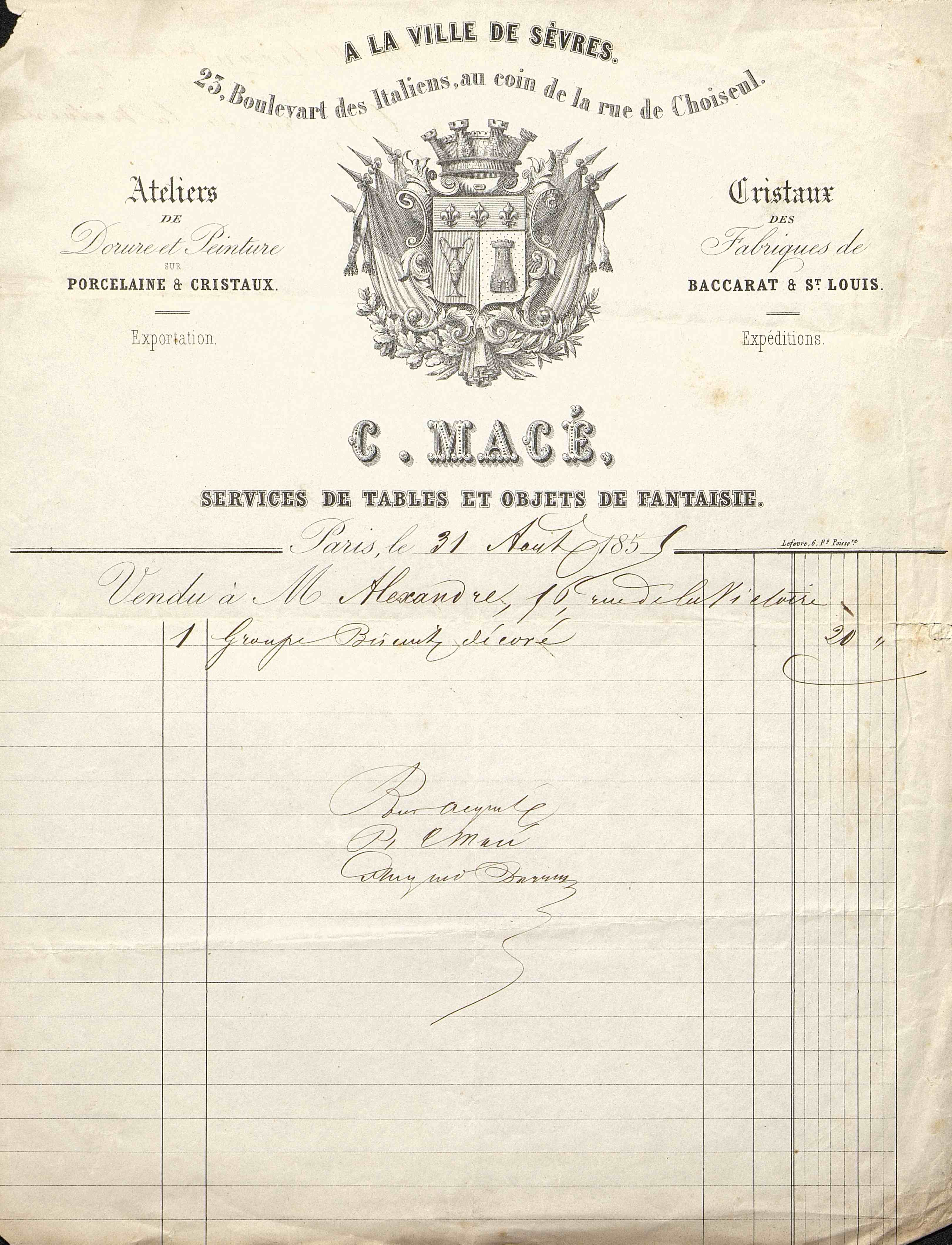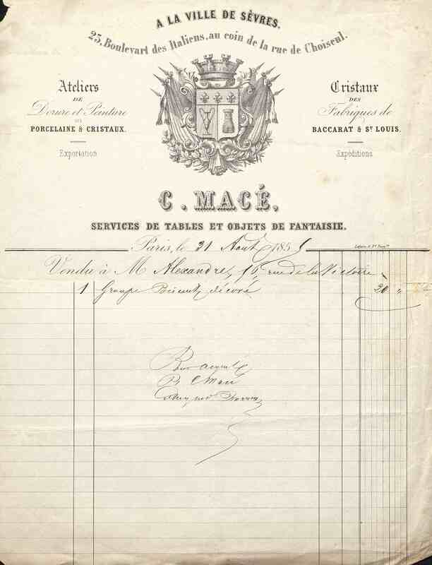 Facture de la Maison Macé : Porcelaine et cristaux, Services de tables et objets de fantaisie.
