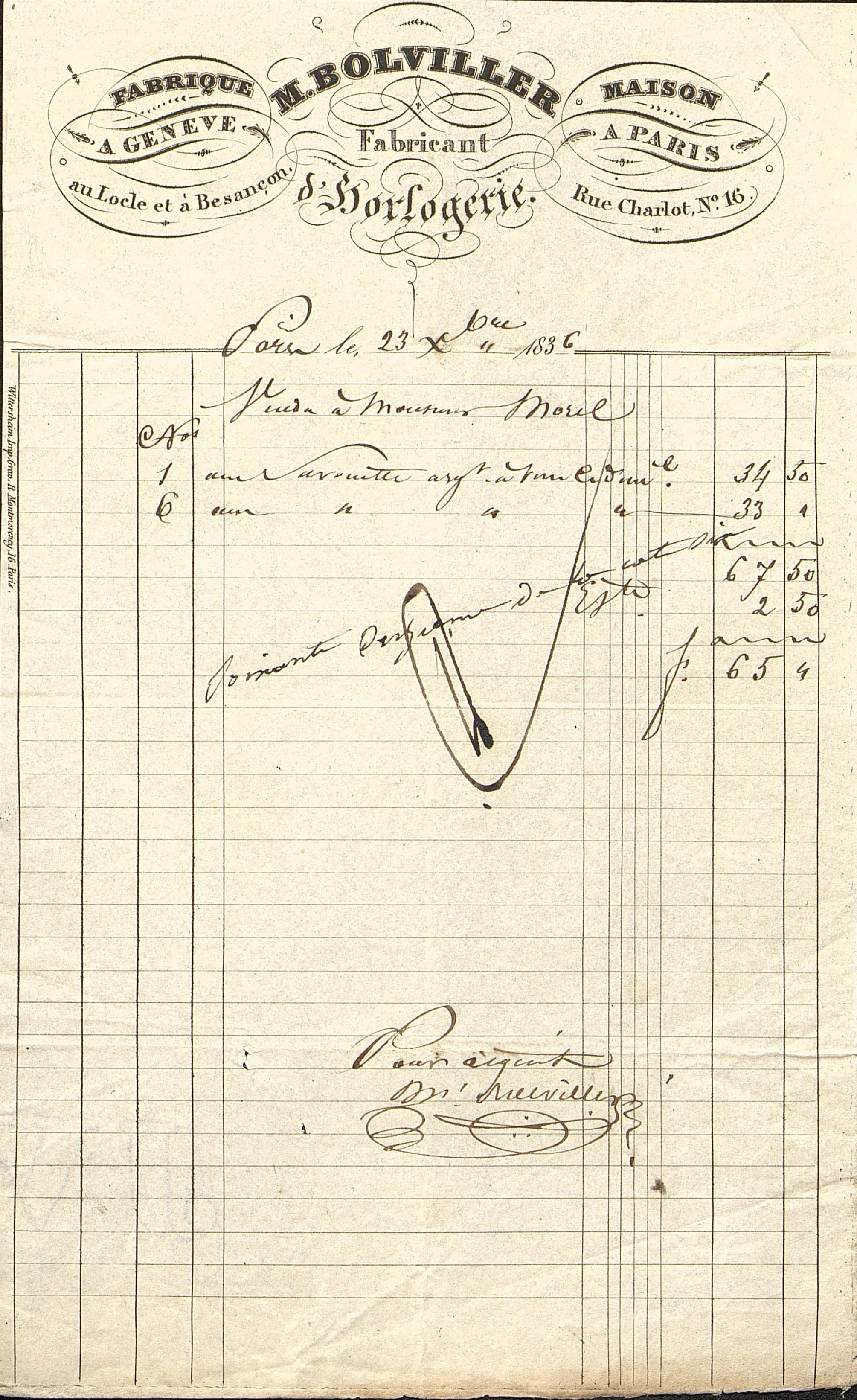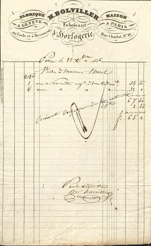 Facture d'une Horlogerie, Maison Bolviller à Paris et Genève.