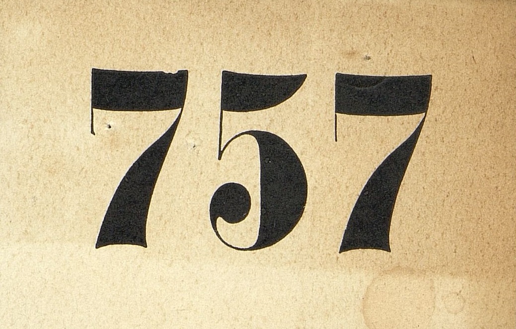 Numéro 757. Probablement numéro de place pour le repas à la salle des banquets de la Préfecture de la Dordogne pour la venue du Président du conseil et du Ministre de l'agriculture à Périgueux le 10 octobre 1909.