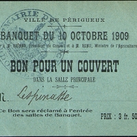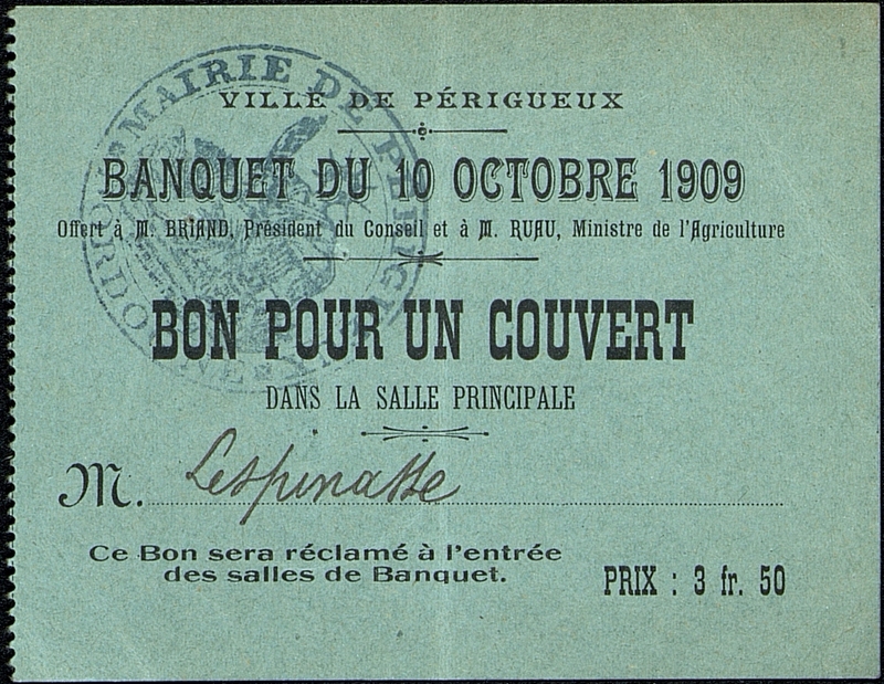 - Ticket au nom de M. Lespinasse. Tampon Mairie de Périgueux. Banquet offert à M Briand président du Conseil et à M Ruau ministre de l'agriculture dans la Salle principale de la préfecture. Prix 3 francs 50 centimes.
