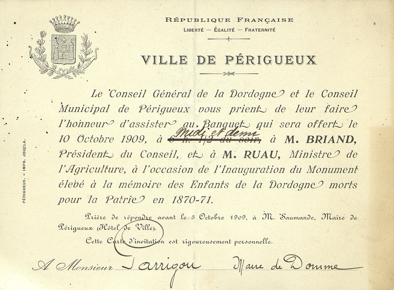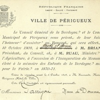 Invitation à un repas auquel participe des membres du gouvernement. Ce courrier nominatif émane de la Mairie de Périgueux et en porte le cachet.