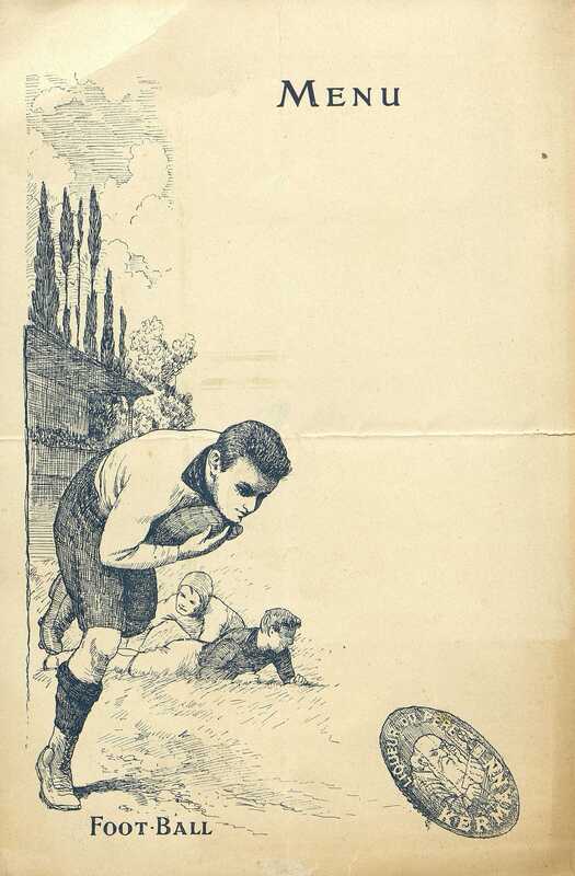 Menu vierge avec un joueur portant un ballon de rugby et titré Football. Publicité pour la Liqueur du Père Kermann.