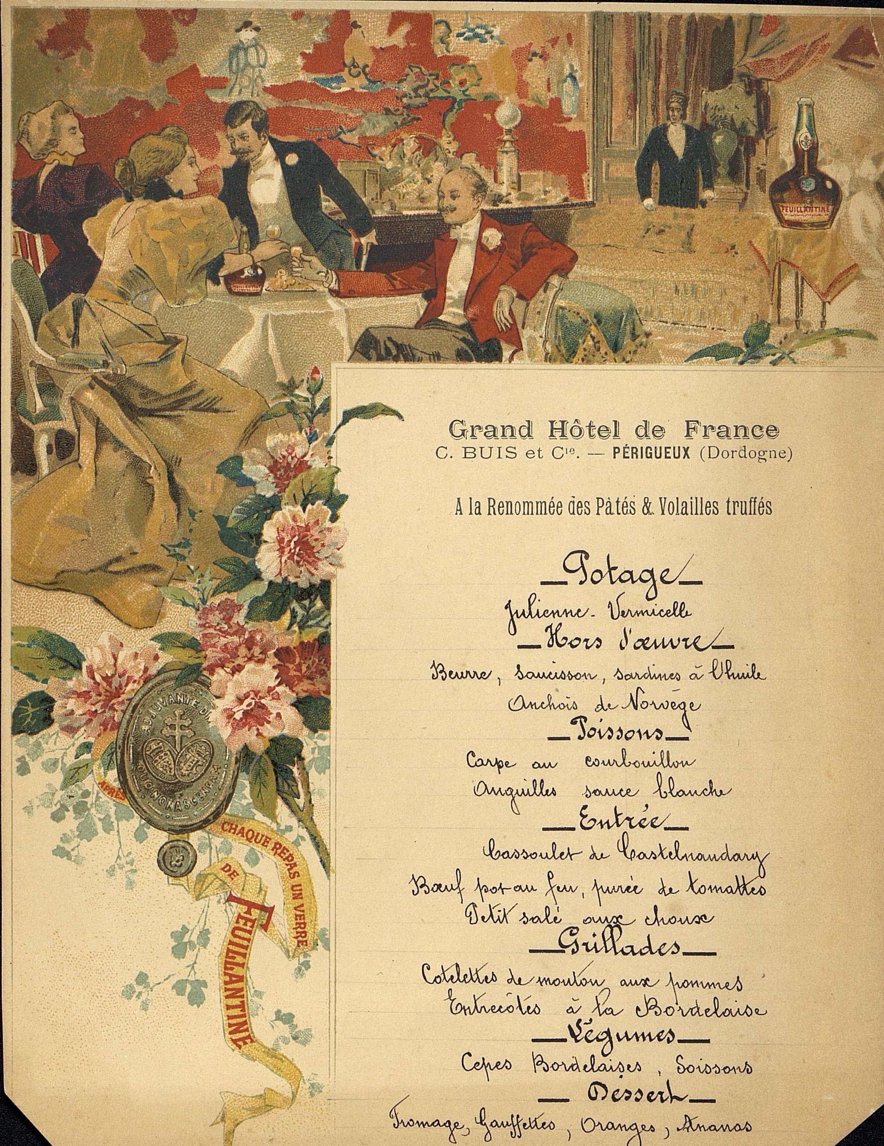 Menu. Plats servis : Potage : Julienne vermicelle. Hors d’œuvres : beurre, saucisson, sardines à l'huile, anchois de Norvège. Poissons : Carpe au Cour-bouillon, Anguilles sauce blanche. Entrée : Cassoulet de Castelnaudary, Bœuf pot-au-feu, purée de tomates, Petit salé aux choux. Grillades : Côtelettes de mouton, Entrecôtes à la Bordelaise. Légumes : Cèpes Bordelaise, Soissons. Desserts: Fromage, Gaufrettes, Oranges; Ananas.