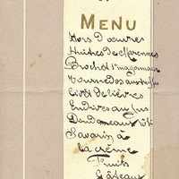 Plats servis : Hors d' œuvres. Huîtres de Marennes. Brochet s[auc]e mayonnaise. Tournedos aux truffes. Civet de lièvres. Endives au jus. Dindonneaux rôtis. Savarin à la crème. Fruits. Gâteaux.