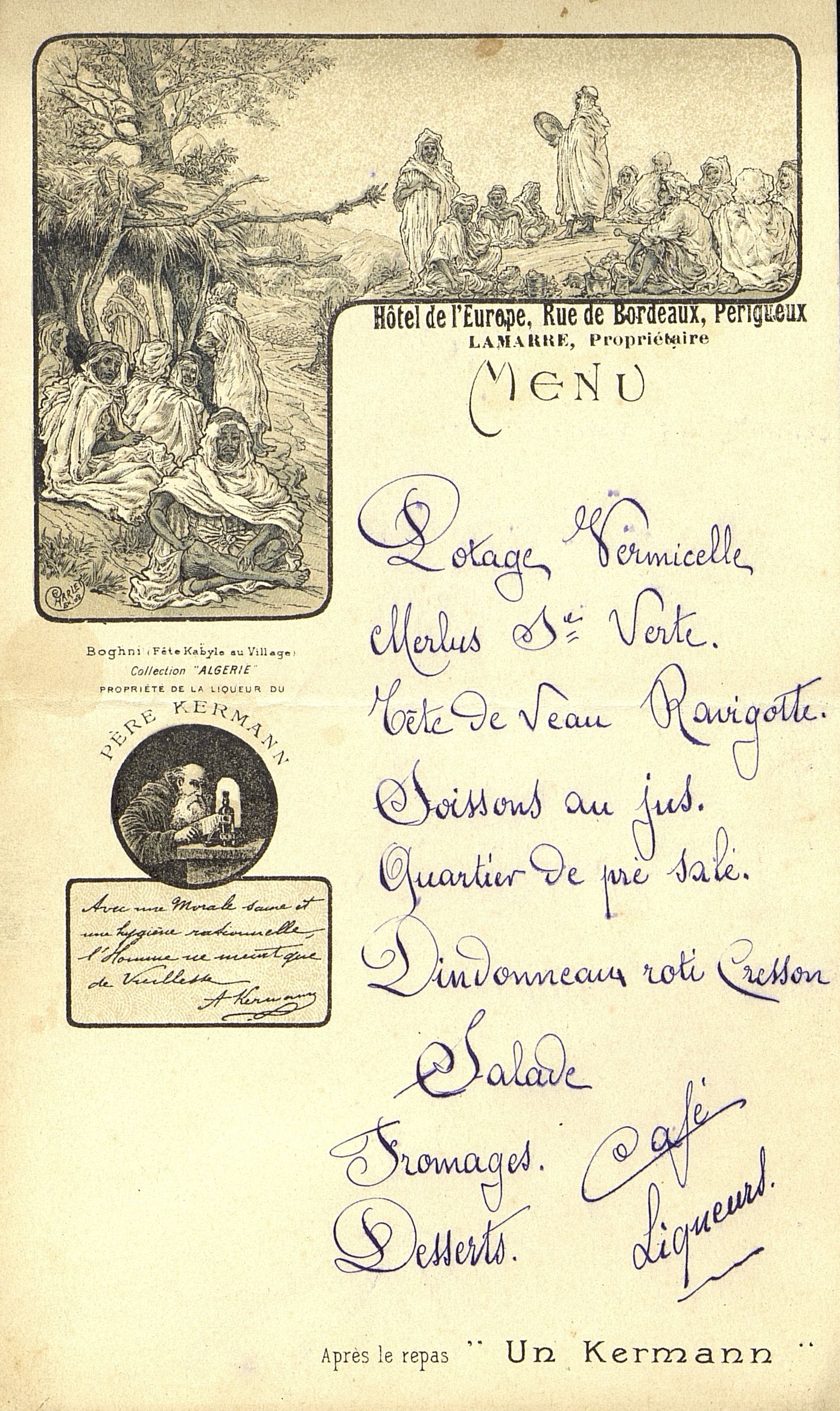 Menu illustré et publicitaire (Père Kermann).