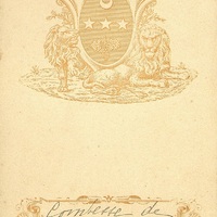 Menu manuscrit avec des armoiries de la famille d'Arlot de Saint-Saud. Menu attribué à la Comtesse de Saint-Saud. Armoiries : d'azur à trois étoiles d'argent rangées en fasce, accomagnées en chef d'un croissant de même et en pointe d'un arlot (ou grappe de raisin), aussi d'argent pampré et feuillé de sinople. Supporté à dextre par un lion agenouillé et à senestre par un lion en majesté enrichi de branche de laurier et surmonté d'une couronne de marquis.