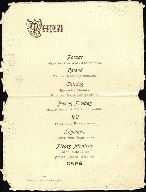 - Plats servis : Potages : Consommé de Volaille Tapioca. Relevé : Truite sauce Rémoulade. Entrées : Bouchées Mongla. Filet de Bœuf aux Truffes. Pièces froides : Galantine à la gelée de Madère. Rôt : Faisans de Rambouillet. Légumes : Petits Pois Parisienne. Pièces Montées : Croquembouches. Petits Fours assortis..