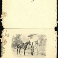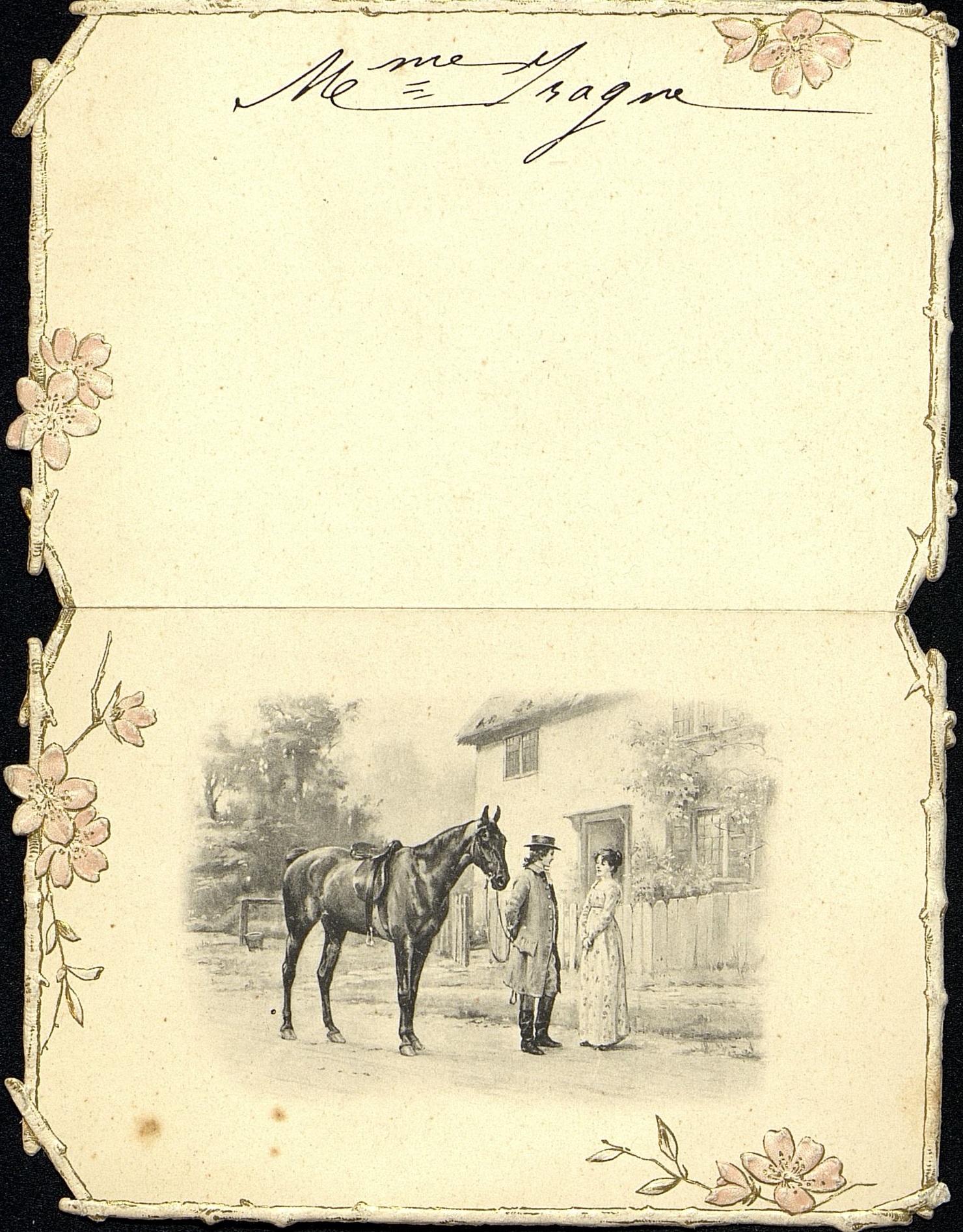 Menu dépliant avec pour illustration un cavalier en conversation avec une femme. Encadrement en relief avec des branches dorées d'églantine en fleurs. Menu attribué à Madame Iragne.