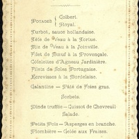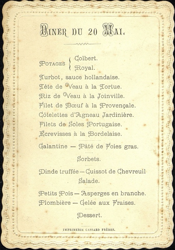 Potage Colbert et Royal. Turbot sauce hollandaise.Tête de veau à la Tortue. Ris de veau à la Joinville. Filet de Bœuf à la Provençale. Côtelettes d'Agneau Jardinière. Filets de Soles Portugaise. Écrevisses à la Bordelaise. Galantine. Pâté de Foies gras. Sorbets. Dinde truffée-Cuissot de chevreuil. Salade. Petits Pois-Asperges en branche. Plombière-Gelée aux fraises. Dessert.