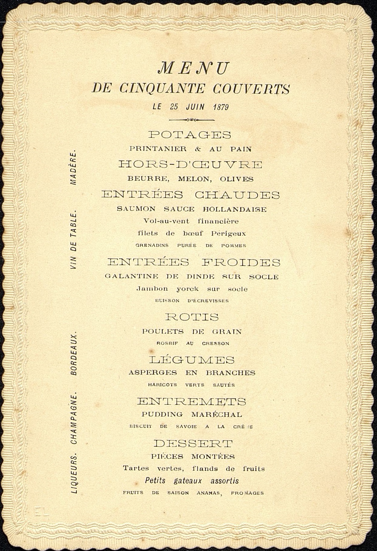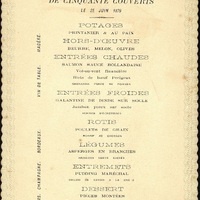 Potages Printanier et au Pain ; Beurre, Melon, Olives ; Saumon sauce Hollandaise ; Vol-au-Vent financière, Filet de bœuf Périgueux, Grenadins purée de pommes ; Galantine de dinde sur socle ; jambon d'York sur socle, Buisson d'Ecrevisse ; Poulet de grain, Rosbif au cresson ; Asperges en branches, Haricots verts sautés ; Pudding Maréchal, Biscuit de Savoie à la crème ; Pièces montées ; Tartes vertes, Flancs de fruits, Petits gâteaux assortis ; Fruits de saison, ananas, Fromages.