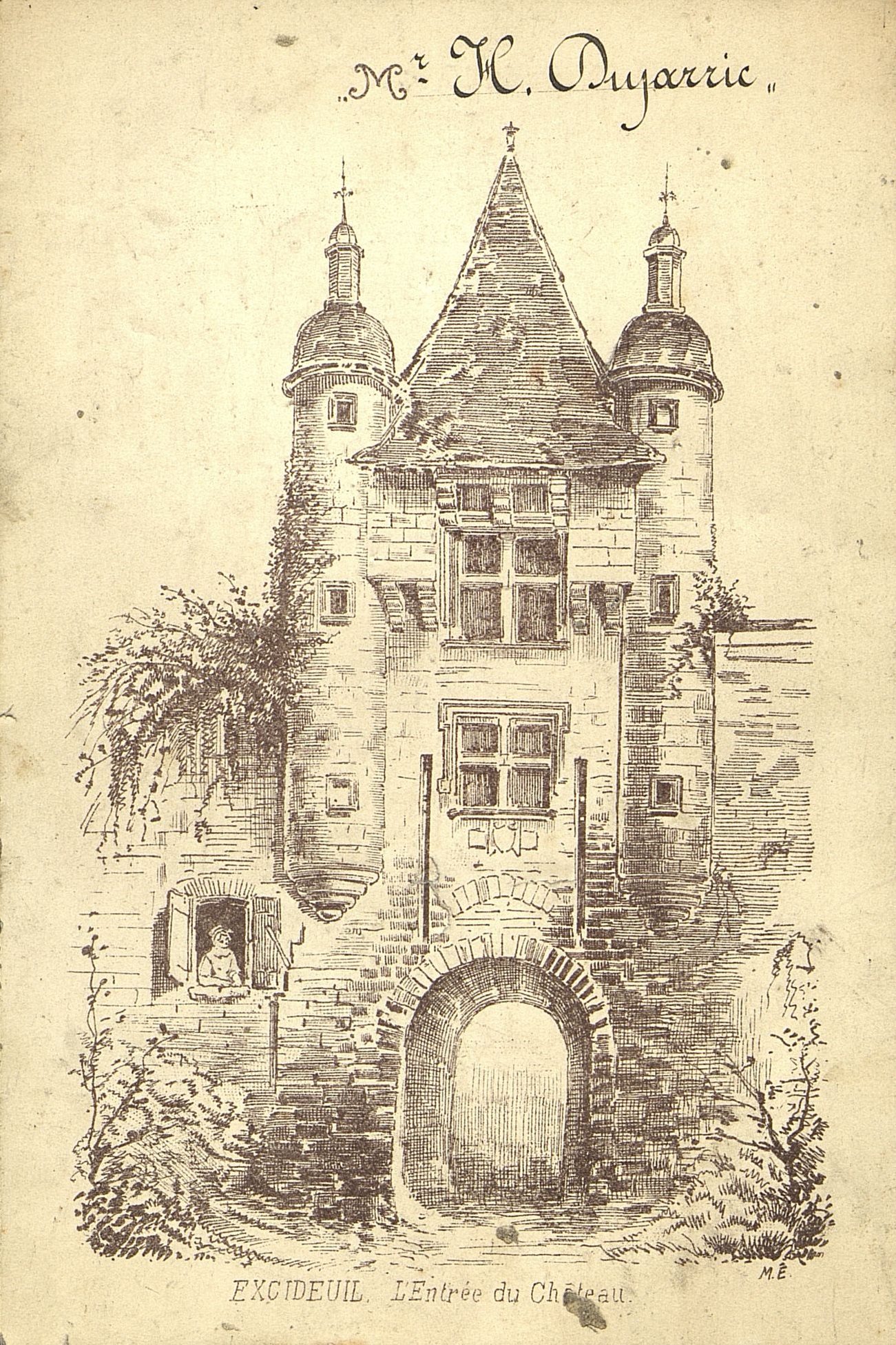 Au dos M. Dujarric sur une gravure du château d'Excideuil . M.E. illustrateur
