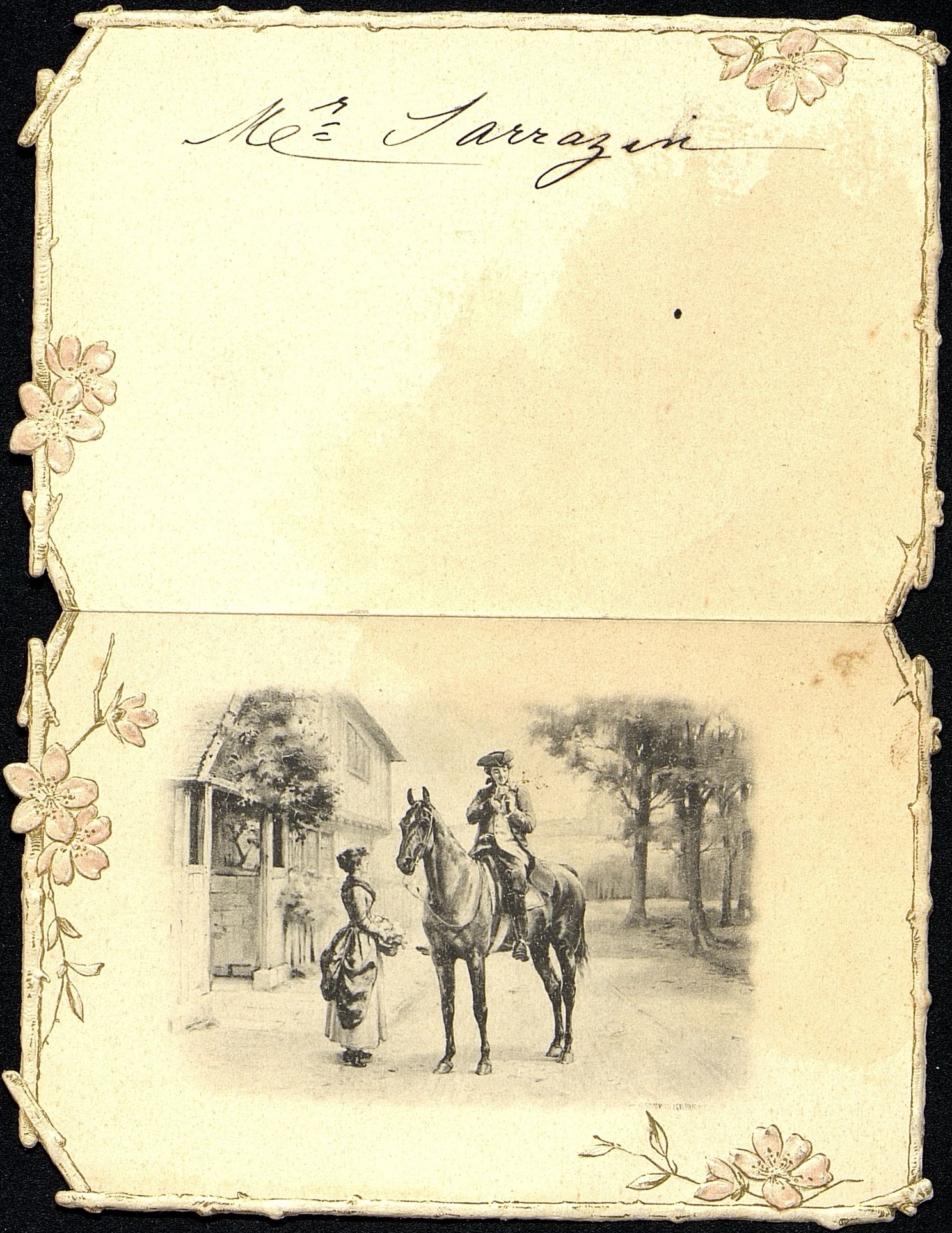Menu illustré d'un cavalier à qui une femme offre une fleur. Au dos Mme Sarrazin en manuscrit.