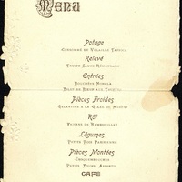 Consommé de Volaille Tapioca ; Truite Sauce Rémoulade ; Bouchées Mongla ; Filet de Bœuf aux Truffes ; Galantine à la Gelée de Madère ; Faisans de Rambouillet ; Petits Pois Parisienne ; Croquembouches ; Petits Fours Assortis ; Café. - Identifiant