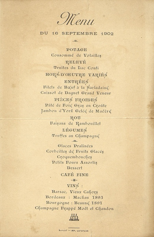 Vins : Barsac ; Vieux Cahors ; Bordeaux : Mackau 1893 ; Bourgogne : Beaune 1891 ; Champagne frappé Moët et Chandon.