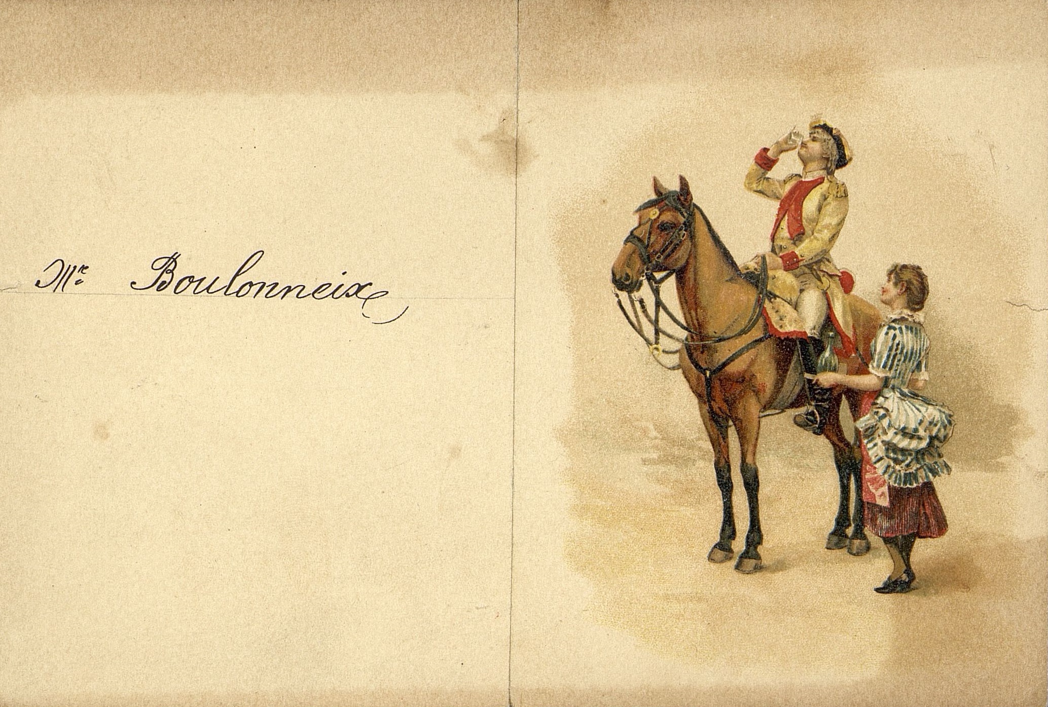 Menu pliant illustré d'un cavalier à qui une femme offre à boire.
