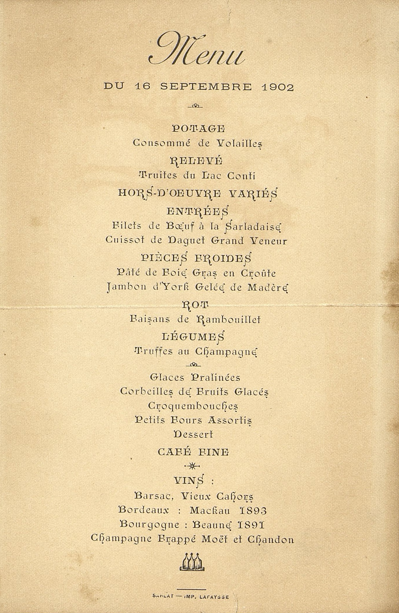 Consommé de Volailles ; Truite du Lac Conti ; Hors-d’œuvre variés ; Filet de Bœuf à la Sarladaise ; Cuissot de Daguet Grand Veneur ; Pâté de Fois gras en Croûte ; Jambon d'York gelée de Madère ; Faisans de Rambouillet ; Truffes au Champagne ; Glaces pralinées ; Corbeille de fruits glacés ; Croquembouches ; Petits fours assortis ; Dessert ; Café fine.
