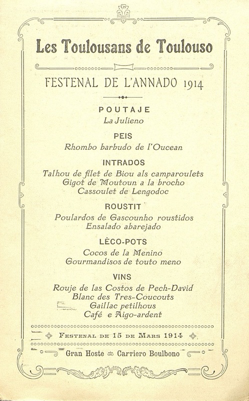 - Plats servis : Poutaje = Potage : Julieno = julienne de légumes. Peis = Poissons : Rhombo barbudo de l'Oucean = Barbue de l'Océan. Intrados = Entrée : Talhou de filet de Biou als camparoulets : Pavé de boeuf aux ...Gigots de moutoun a la brocho = Gigot d'agneau à la broche. Cassoulet de Lengadoc = Cassoulet du Languedoc. Roustit = Rôti : Poulardos de Gascounho roustidous = Poulardes de Gascogne rôties. Ensalado abarejado = Mesclun. Lèco-Pots = Dessert : Cocos de la Menino = Cocos de la Menino. Gourmandisos de touto meno = Petits fours variés ?