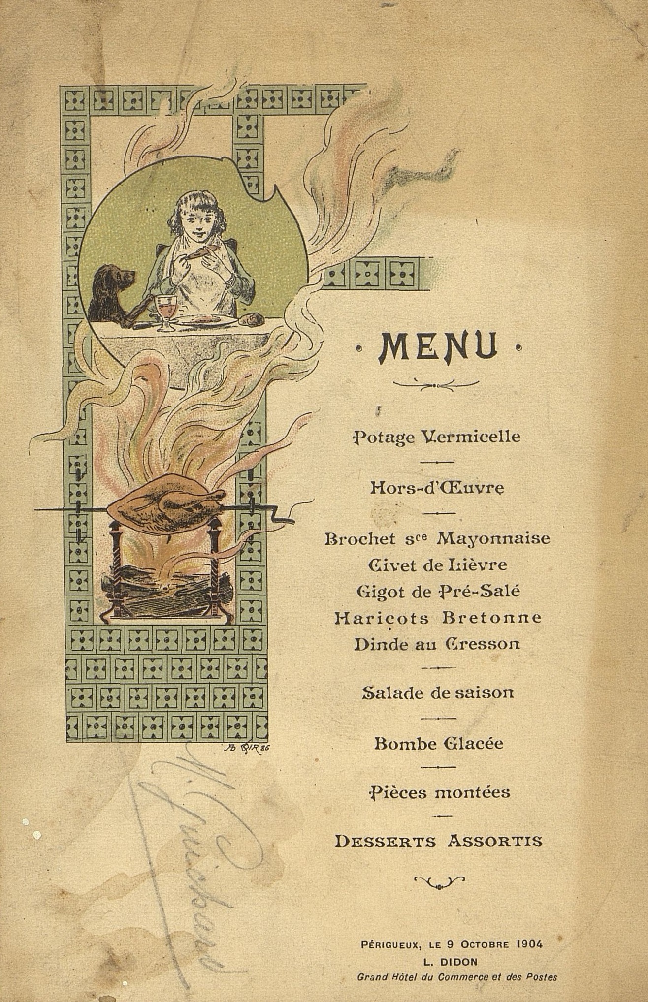 Menu du 9 octobre 1909, tenu au Grand Hôtel du Commerce et des Postes. Ab SQIR 86 . Mention manuscrite à la mine de plomb "M Guichard". illustration : en médaillon une jeune fille à table mange avec ses mains un morceau de poulet alors que son chien la regarde avec envie. En dessous, un poulet cuit au tourne broche dégageant un large panache de fumée.