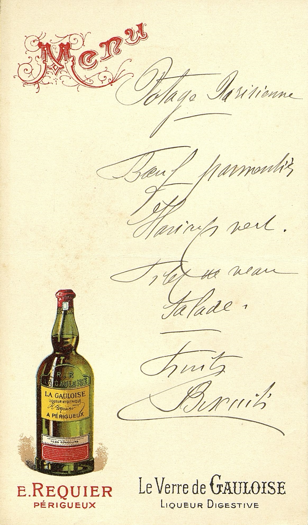 Menu publicitaire "La Gauloise", liqueur digestive.
