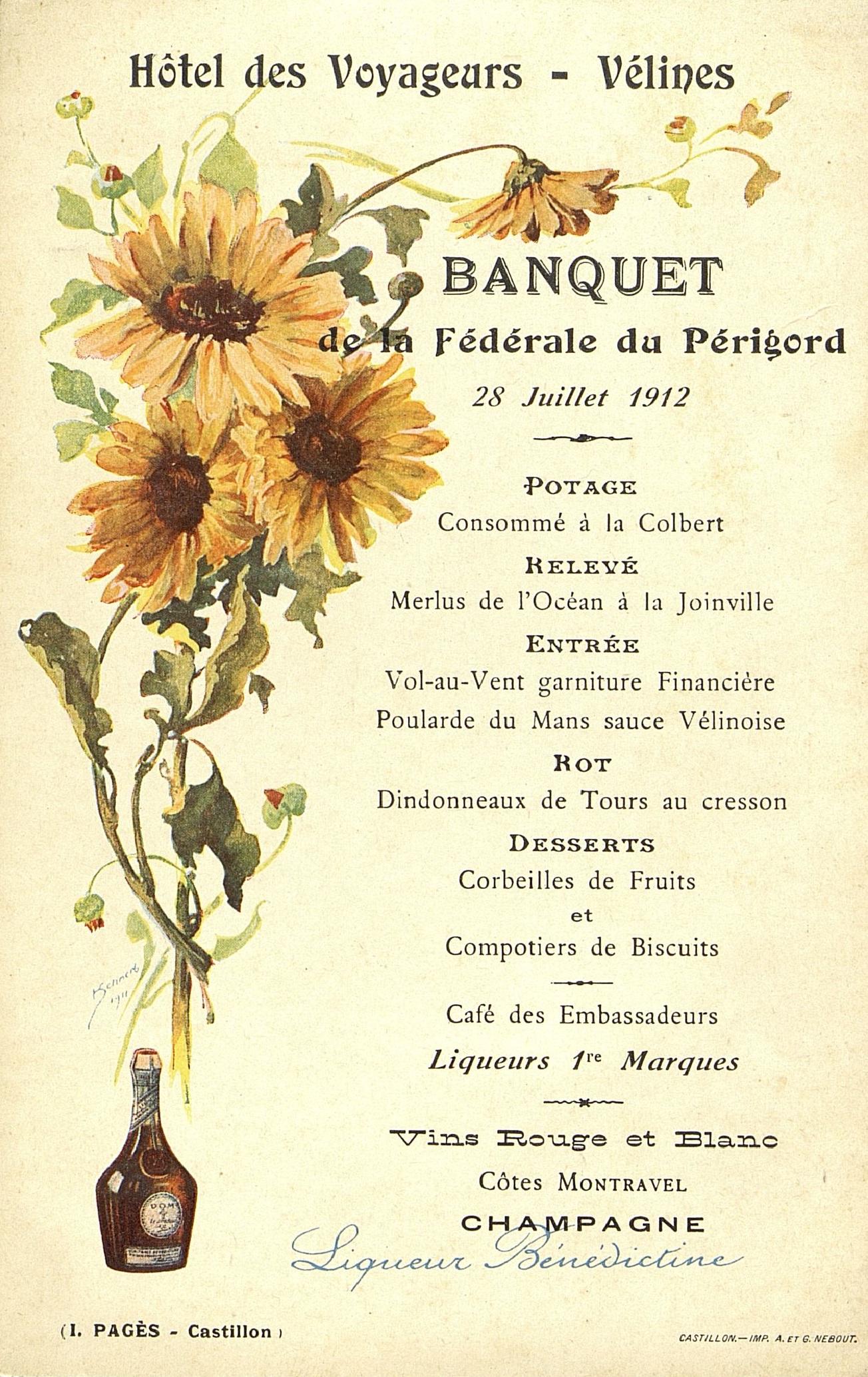 Menu illustré et publicitaire pour la liqueur Bénédictine. Illustration : Fleurs de souci par l'illustrateur ?. Au verso en note manuscrite : Monsieur Fourcade.