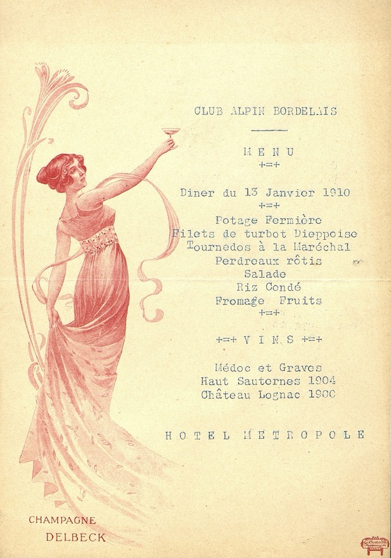 Vins : Médoc et Graves, Haut sauternes 1904, Château Lognac 1900.