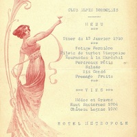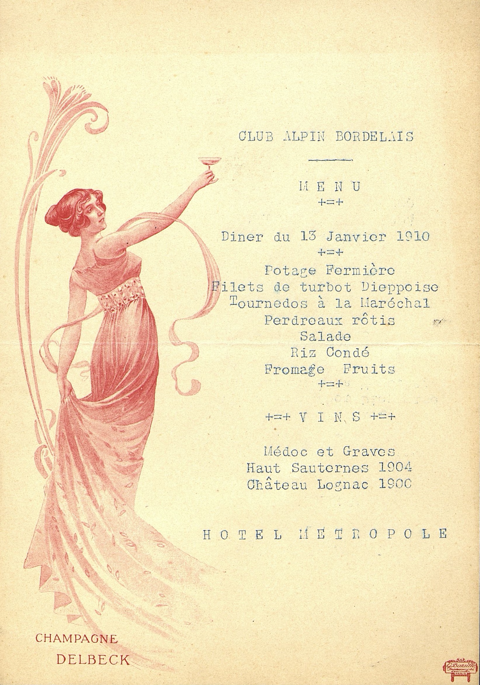 Menu dépliant illustré avec une publicité pour le Champagne Delbeck.