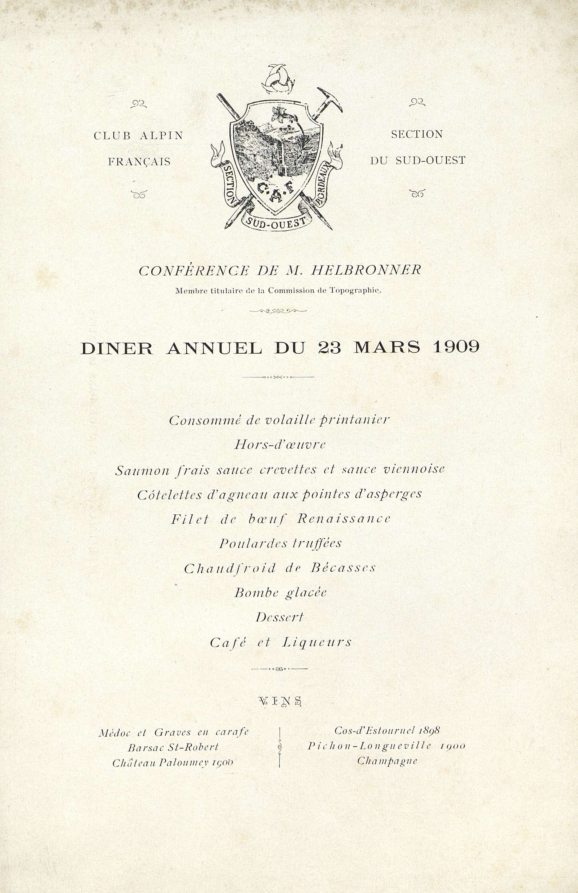 Vins : Médoc et graves en carafe ; Barsac St-Robert ; Château Paloumey 1900 ; Cos-d'Estournel 1898 ; Pichon-Longueville 1900 ; Champagne.