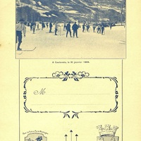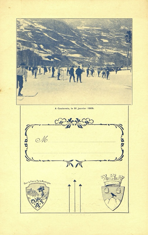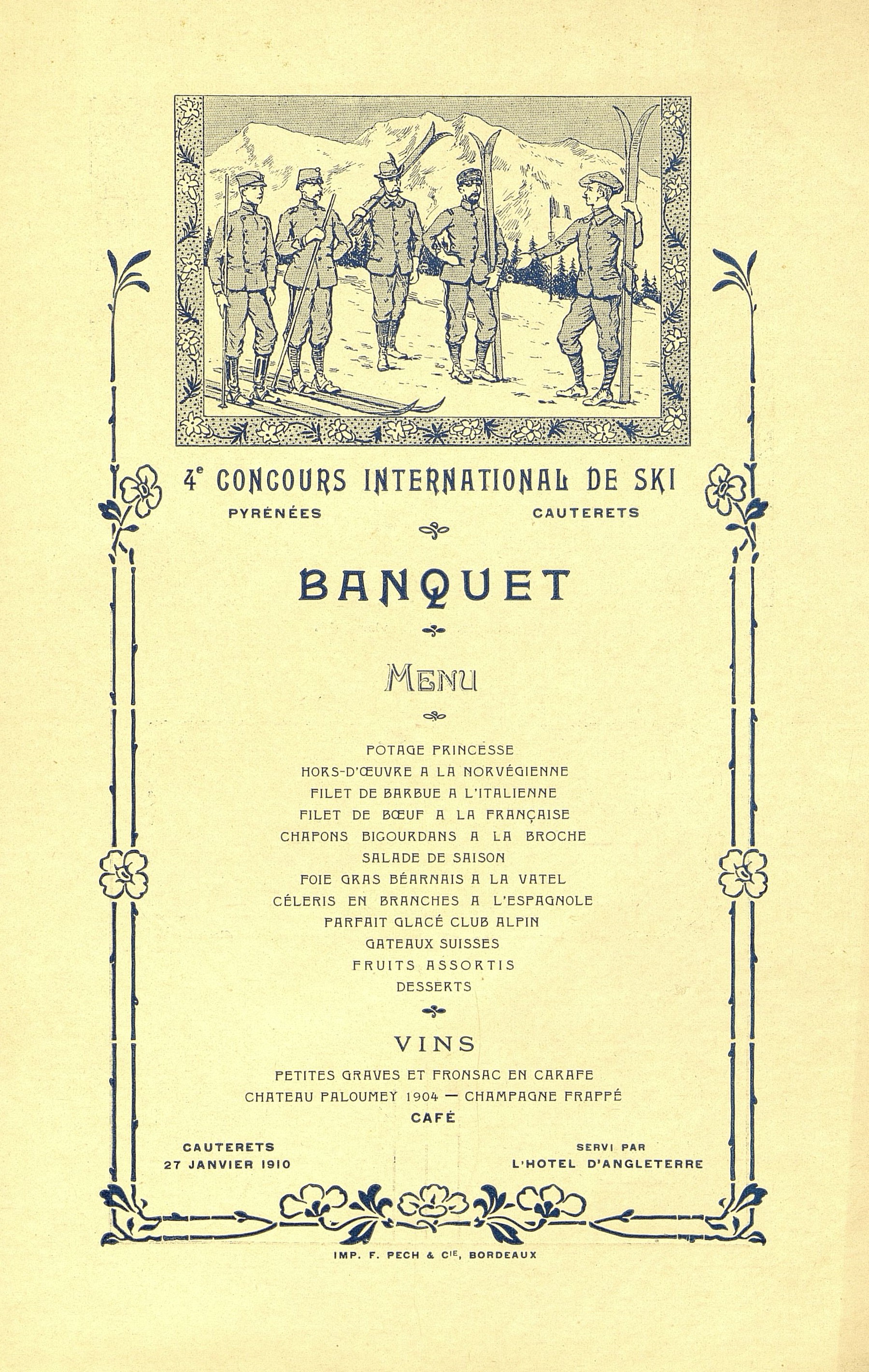Menu du 4e Concours International de Ski à Cauterets. Au dos, une photographie, blasons, et un cartouche pour le nom resté vierge.