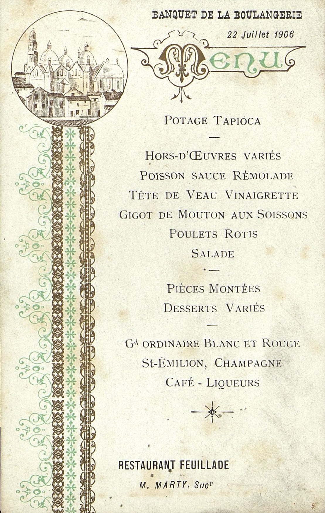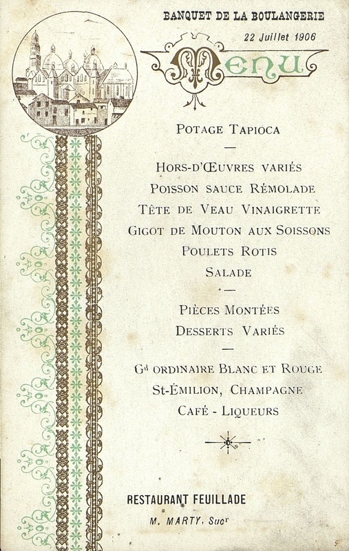 Menu du 22 juillet 1906 pour le Banquet de la Boulangerie. Une vignette ronde avec la Cathédrale St-Front.