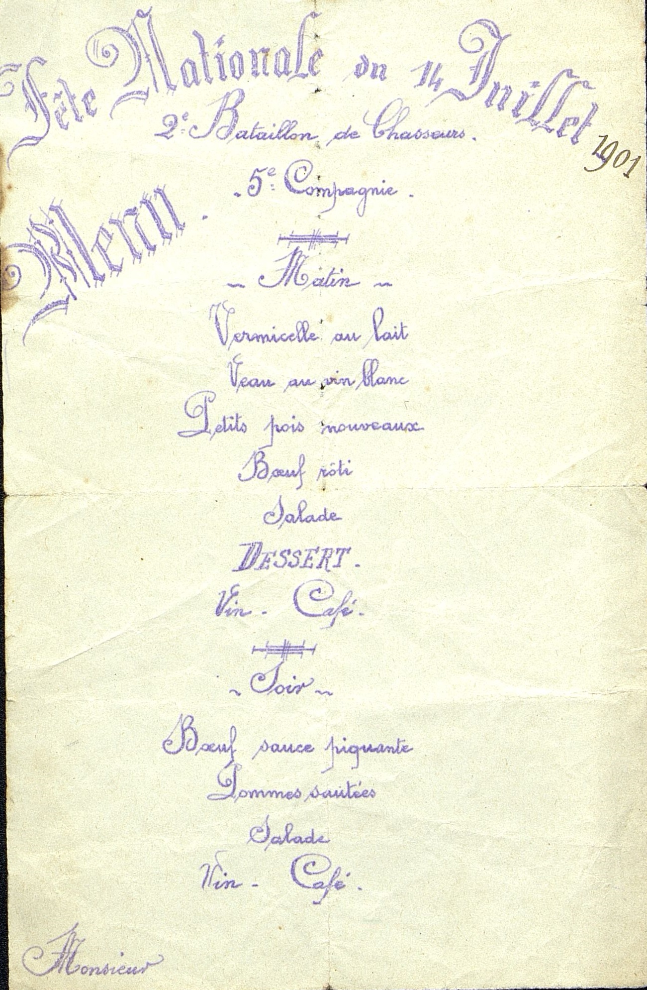 Menu du matin : Vermicelle au lait, Veau au vin blanc, Petits pois nouveaux, Bœuf rôti, Salade, Dessert, Vin, Café.