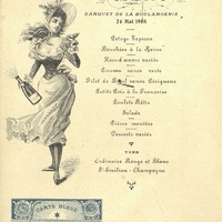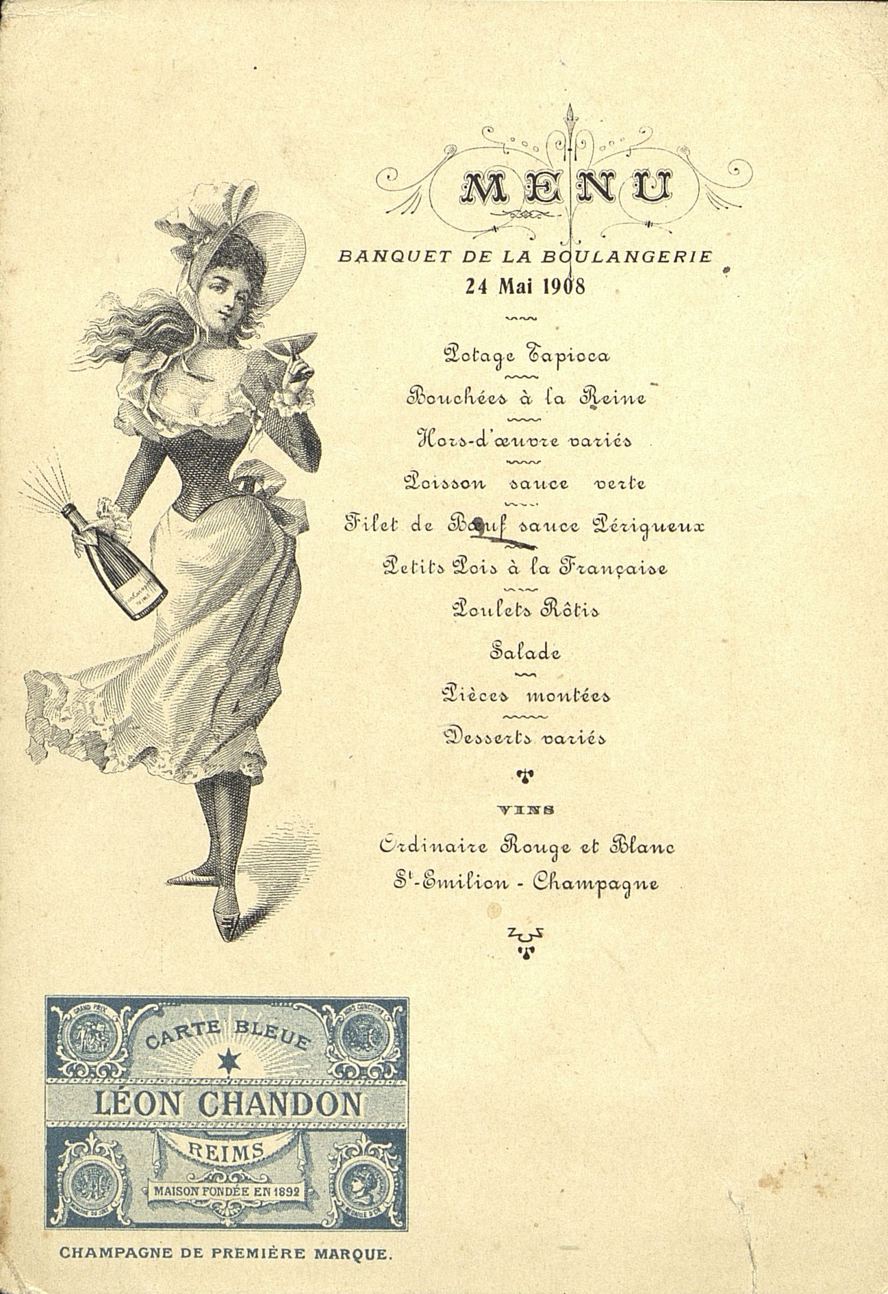Menu illustré et publicitaire d'une femme tenant une bouteille de Champagne Léon Chandon.