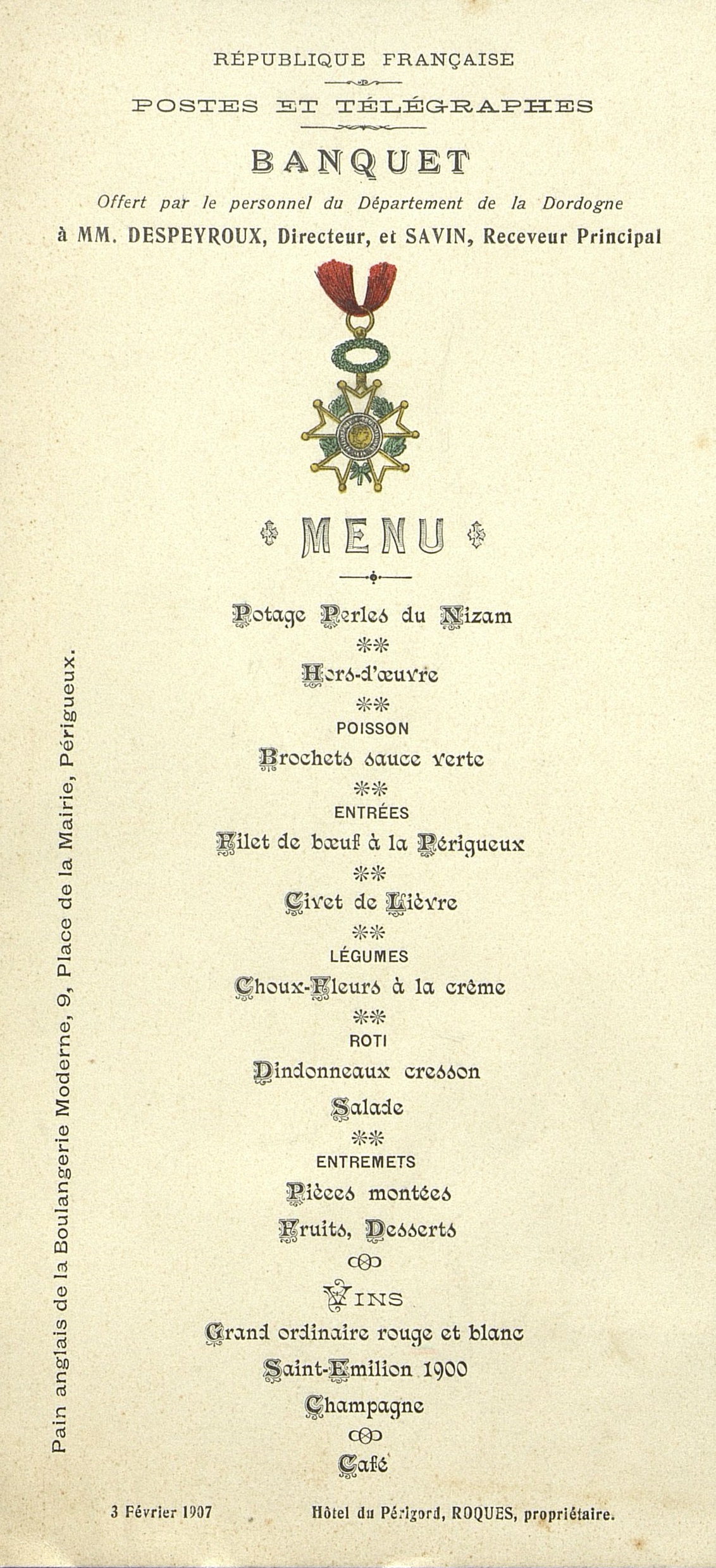 Banquet des Postes et Télégraphes, offert par le Département de la Dordogne à M. Despeyroux, Directeur, et Savin, Receveur Principal.