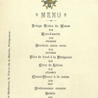 Vins : Grand ordinaire rouge et blanc, St-Emilion 1900, Champagne, Café.