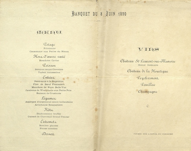 Vins : Château Saint-Laurent-sur-Manoire, Château de la Hourtique, Peycharment, Pauillac, Champagne.