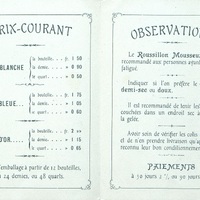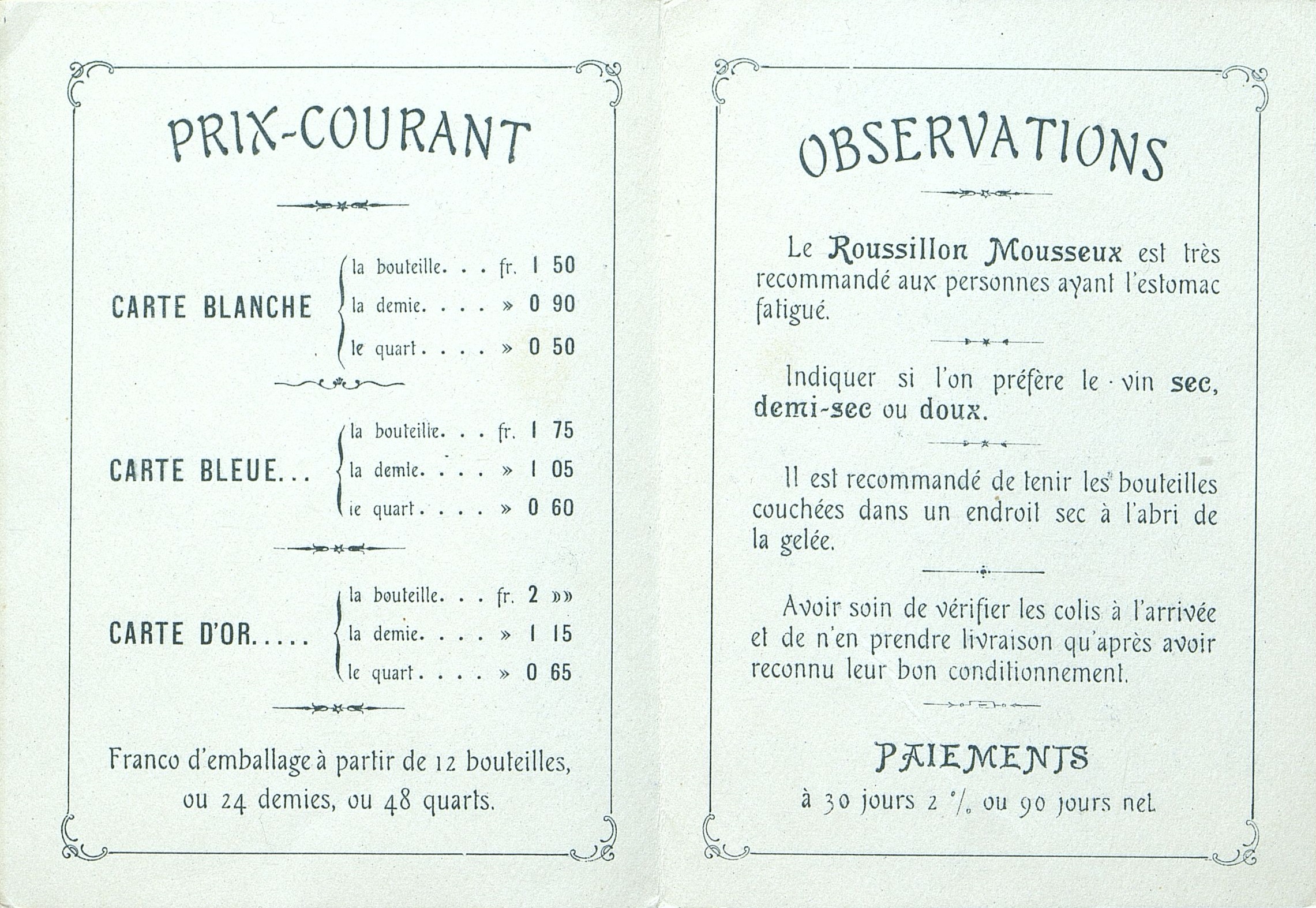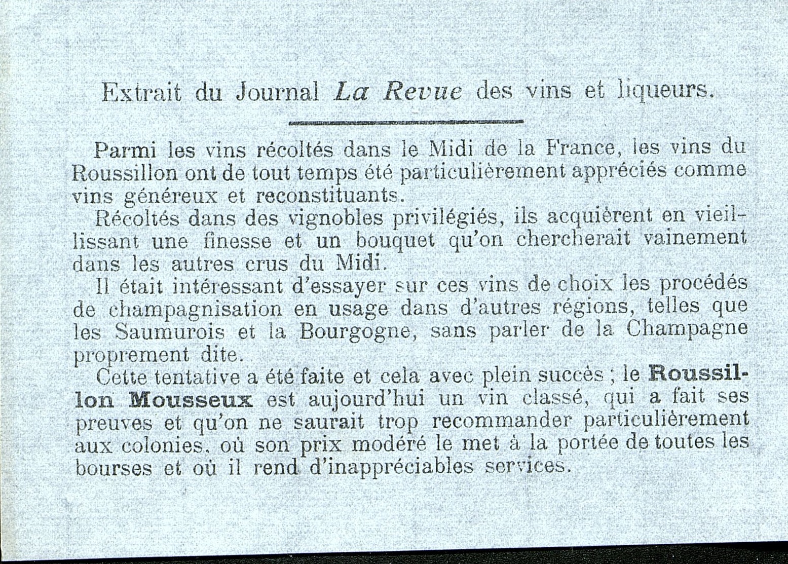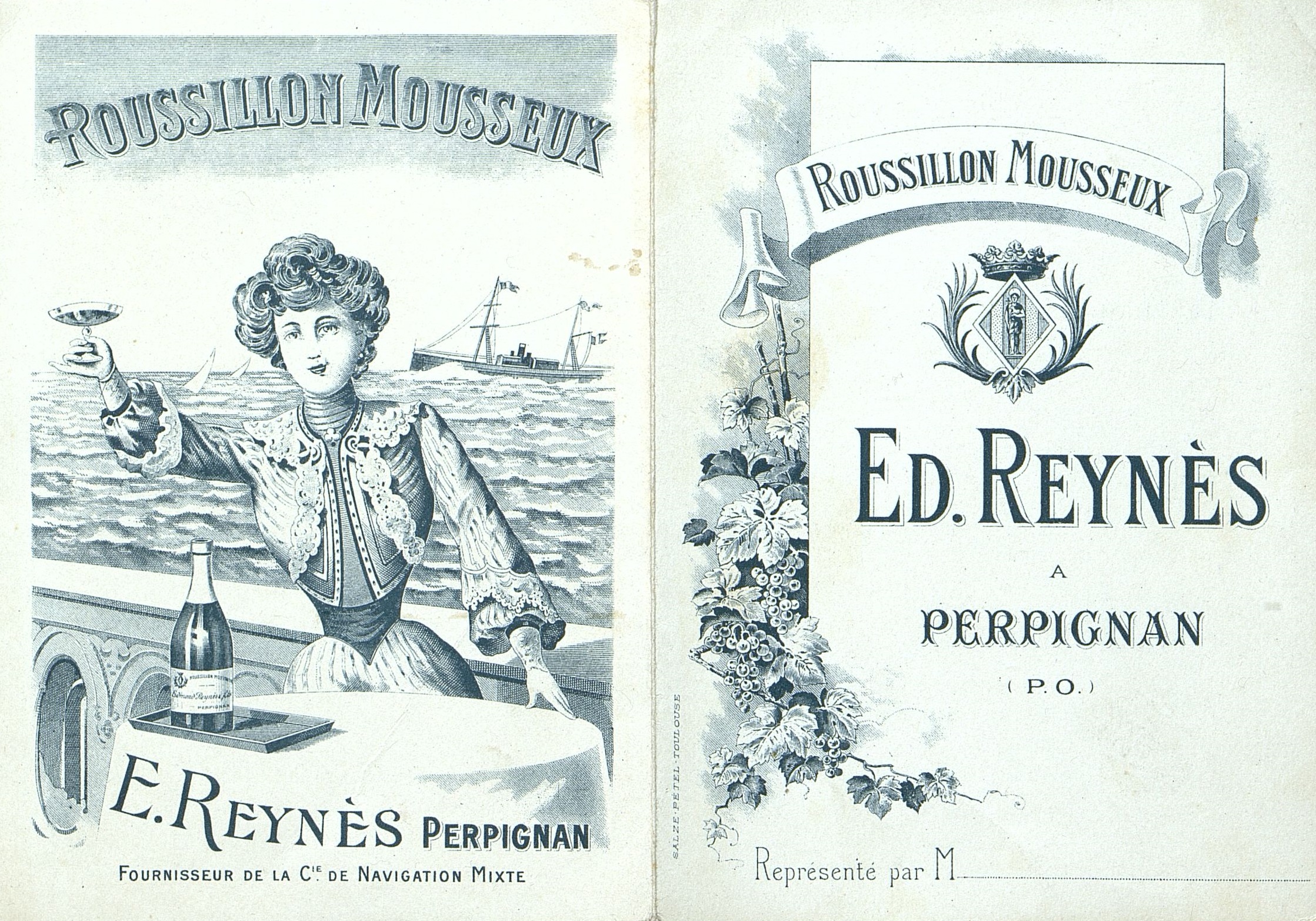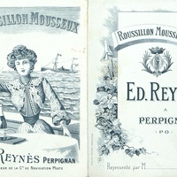 Dépliant publicitaire illustré pour du mousseux et dont la maison de production Reynès se trouve à Perpignan. Pages intérieures, les tarifs et les modalités de commande. Une petite feuille sur papier pelure a été glissée à l'intérieur du dépliant ; il s'agit d'un extrait d'une revue spécialisée en vins.
