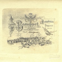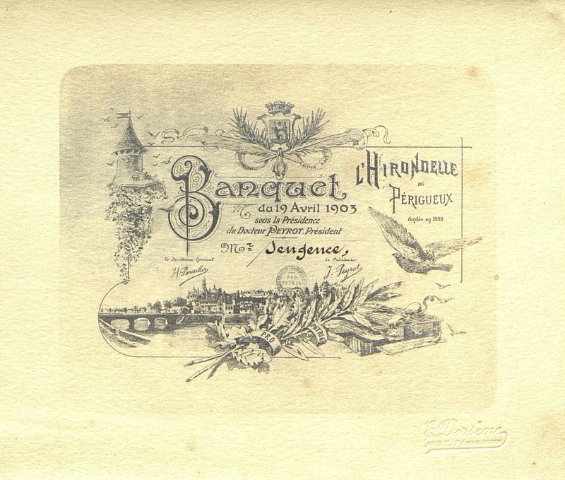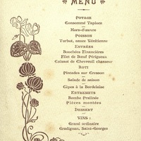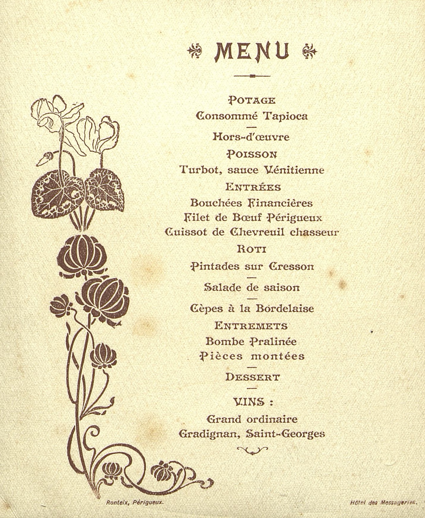 Potage : Consommé tapioca ; Hors d’œuvre : Poisson, Turbot sauce vénitienne ; Entrées : Bouchées Financières, Filet de Bœuf Périgueux, Cuissot de Chevreuil chasseur ; Rôti : Pintades sur cresson ; Salade de saison ; Cèpes à la Bordelaise ; Entremets : Bombe Pralinée, Pièces montées ; Dessert.