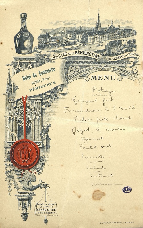 Menu publicitaire "La Bénédictine", pour l'Hôtel du Commerce à Périgueux. Menu Manuscrit. Illustration en bandeau par le Palais Bénédictine de Fécamp, une bouteille sur la gauche présentée sur un campanile gothique avec un cul de lampe servant d'attache à un dragon porte enseigne. Listel avec sceau pendant de cire rouge aux armes de l'abbaye bénédictine de Fécamp.
