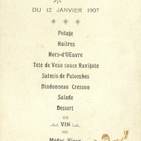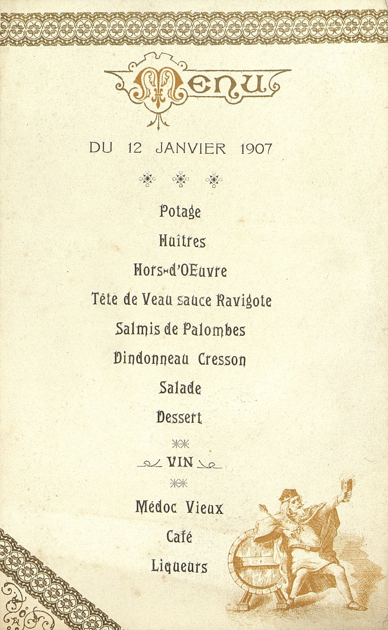 Menu illustré du 12 janvier 1907. Personnage tenant un spectre, adossé à une barrique et levant une chope de bière. Notes manuscrites au dos.