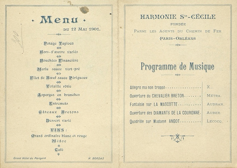 Menu : Potage tapioca. Hors d’œuvres variés. Bouchées financière. Merlu sauce vert-pré. Filet de bœuf sauce Périgueux. Volaille rôtie. Asperges en branches. Dessert varié.