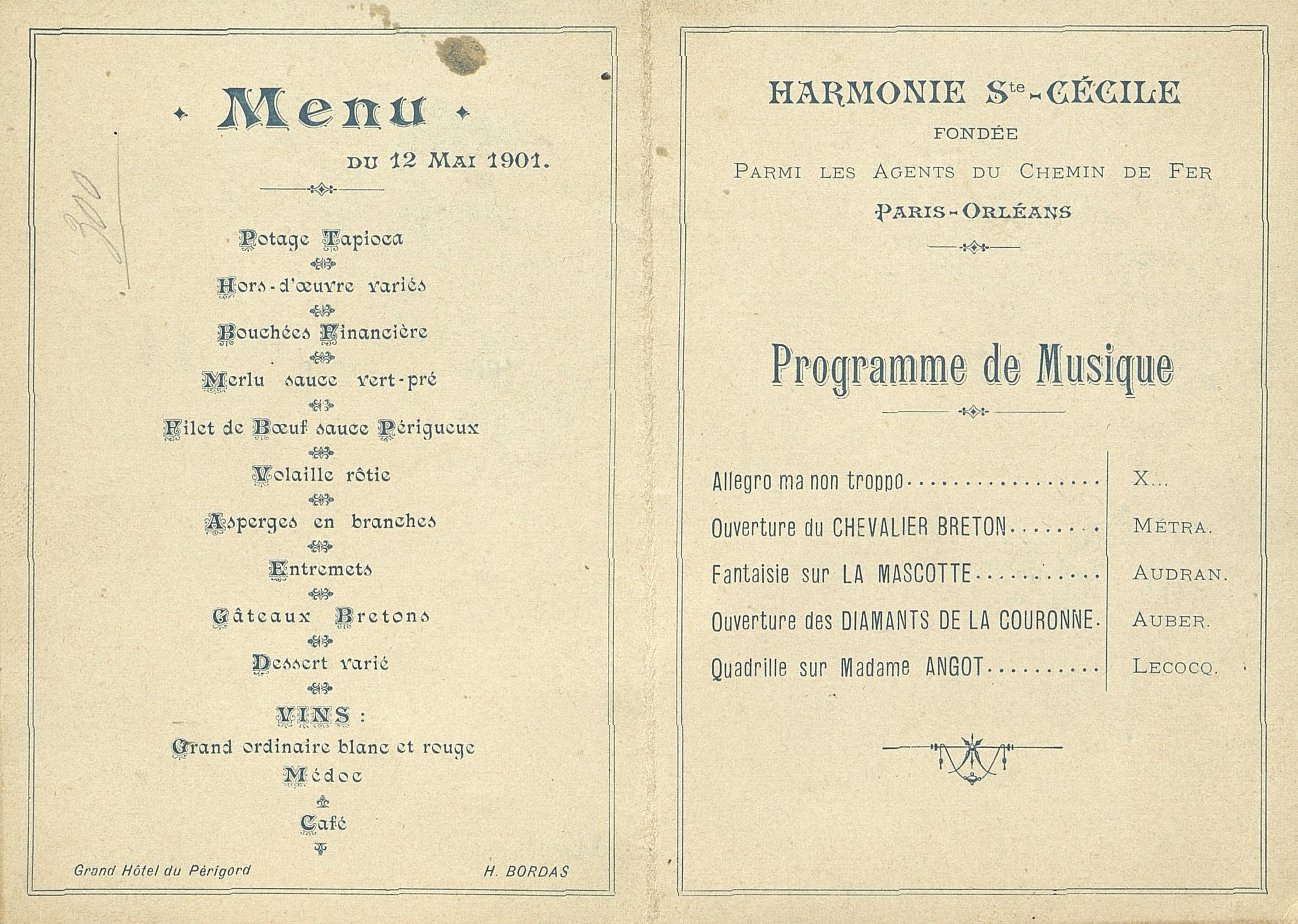 Harmonie Sainte-Cécile fondée parmi les agents du Chemin de Fer Paris-Orléans. Bal à 10 heures.