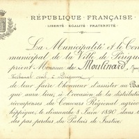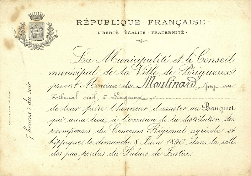 Carton d'invitation à un banquet adressé à M. le Juge du tribunal civil de Périgueux pour assister à un baquet à l'occasion de la distribution de récompenses du Concours régional agricole et hippique.