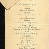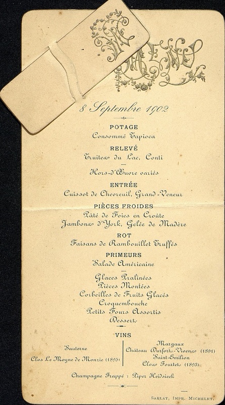 Menu : Consommé Tapioca. Truites du Lac Conti. Hors d’œuvre variés. Cuissot de chevreuil, Grand Veneur. Pâté de foies en croûte. Jambon d' York. Gelée de Madère. Faisans de Rambouillet truffés. Salade américaine. Glaces pralinées. Pièces montées. Corbeilles de fruits glacés. Croquembouche. Petits-Fours assortis. Dessert.