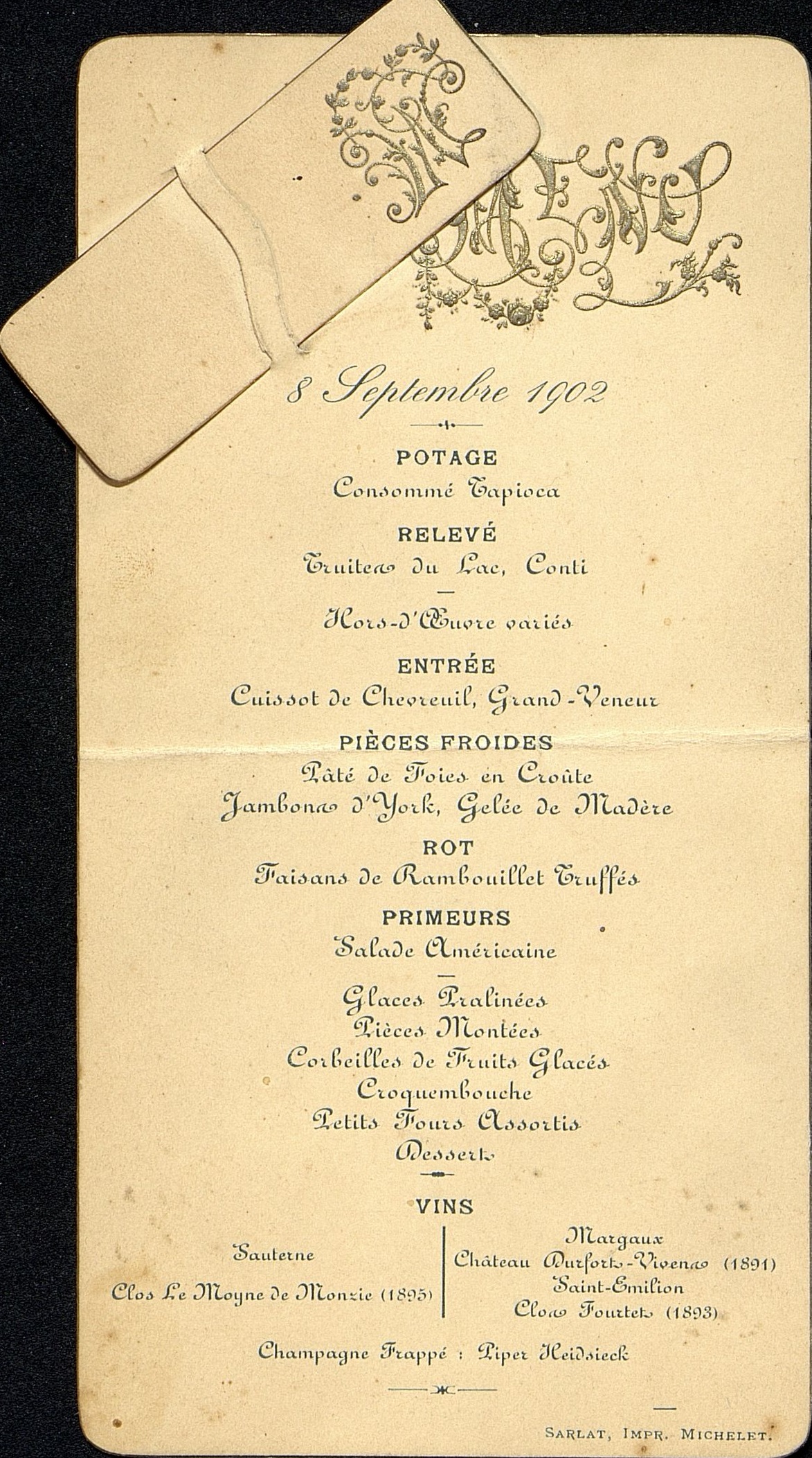 Boissons : Vins : Sauterne. Clos Le Moyne de Monzie (1895). Margaux. Château Durfort-vivens (1891). St-Emilion.Clos Fourtet (1893). Champagne Frappé : Piper Heidsieck.