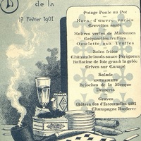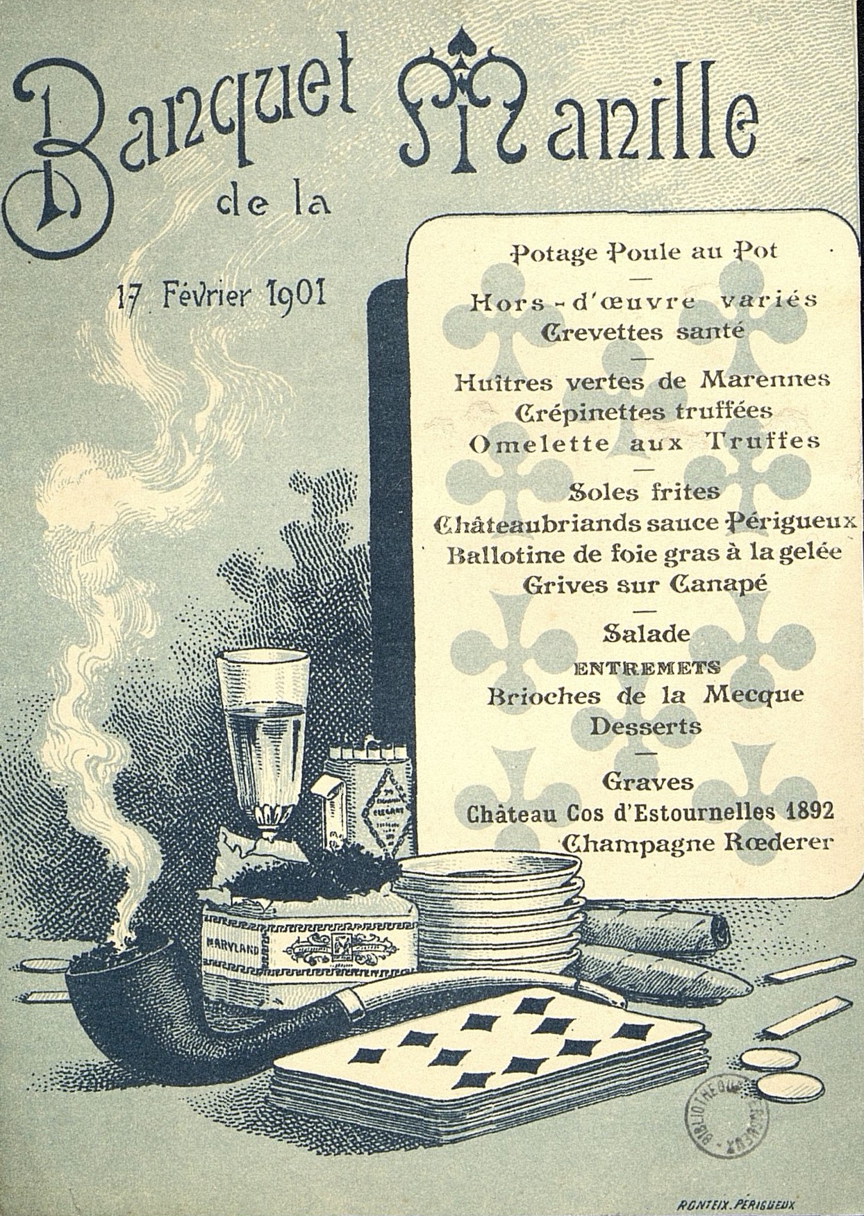 Menu : Potage Poule au Pot. Hors d’œuvre variés. Crevettes santé. Huitre vertes de Marennes. Crépinettes truffées. Omelette aux truffes. Soles frites. Châteaubriands sauce Périgueux. Ballotine de foie gras à la gelée. Grives sur Canapé. Salade. Entremets. Brioches de la Mecque. Desserts.