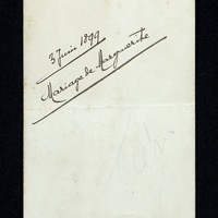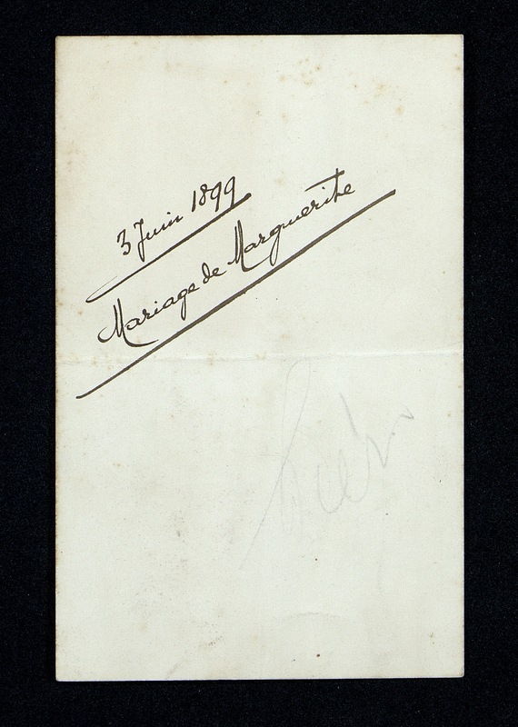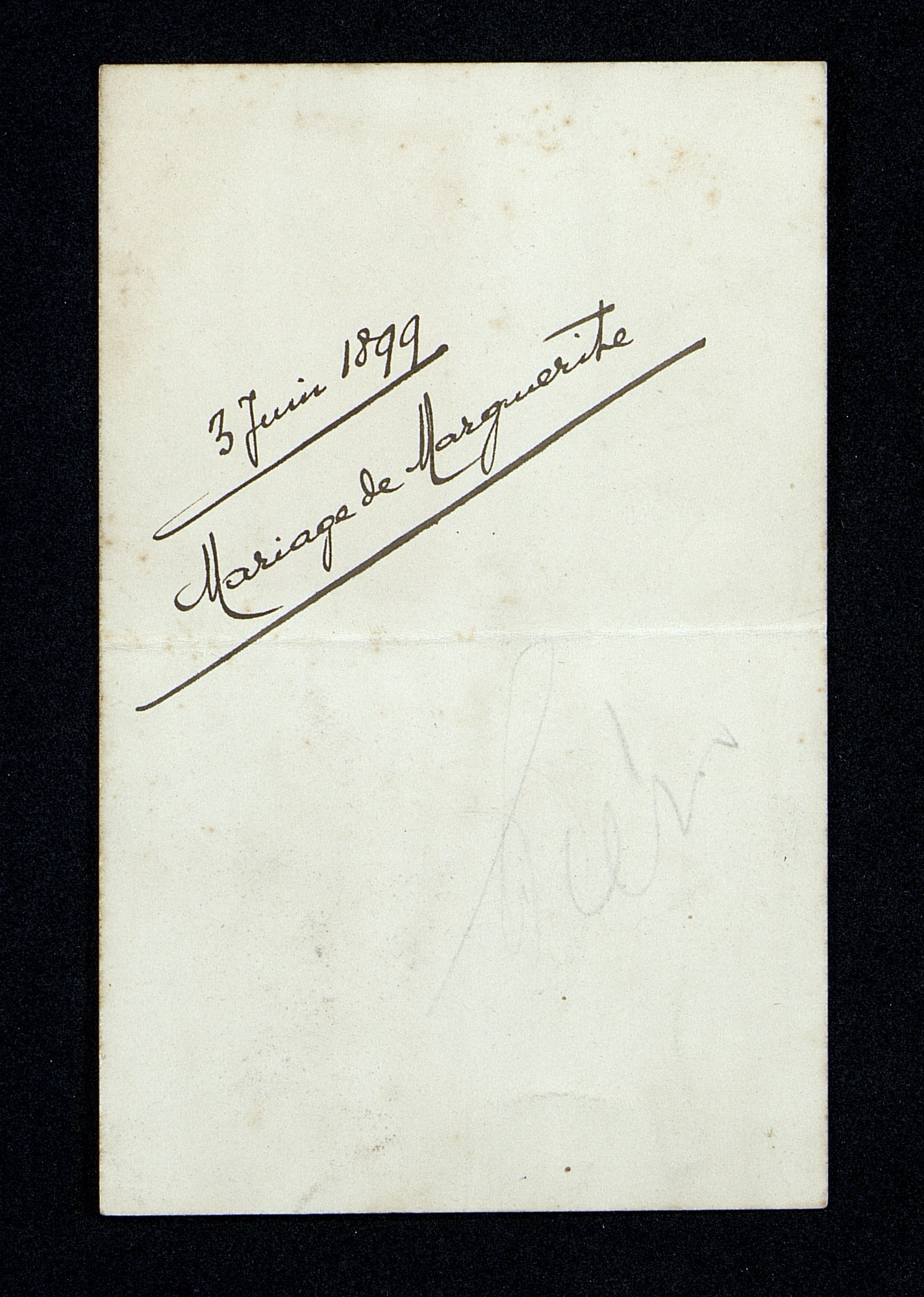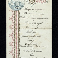 Au recto : Menu imprimé avec un dessin de la cathédrale Saint-Front de Périgueux et du quartier des Rues-Neuves dans une présentation en oculus avec au-dessous à gauche un ruban vertical festonné rouge et or . Au verso : texte manuscrit " 3 juin 1899, Mariage de Marguerite ".