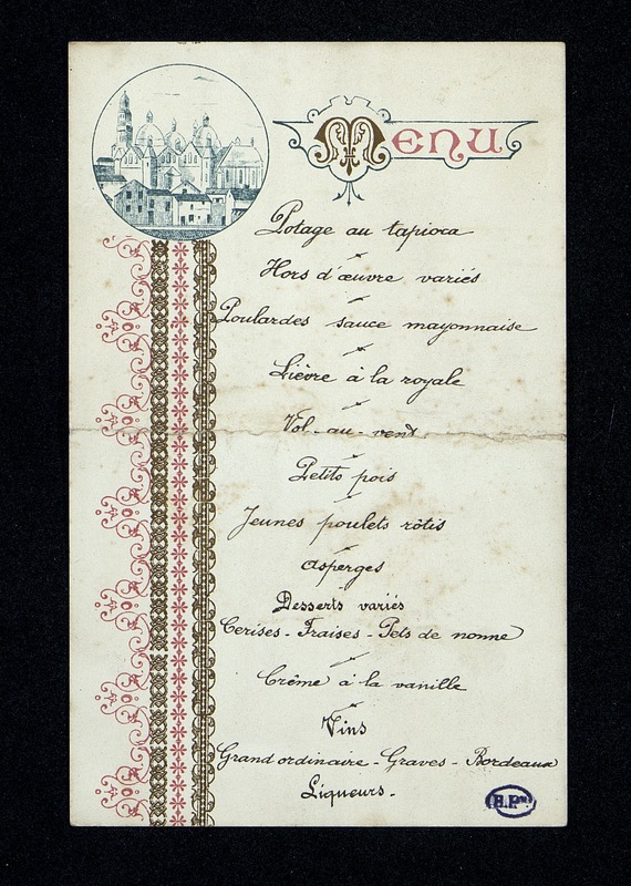 Menu : Plats servis : Potage au tapioca. Hors d’œuvre variés. Poularde sauce mayonnaise. Lièvre à la royale. Vol-au-vent. Petits pois. Jeunes poulets rôtis. Asperges. Desserts variés. Cerises. Fraises. Pets de nonne. Crème à la vanille.
