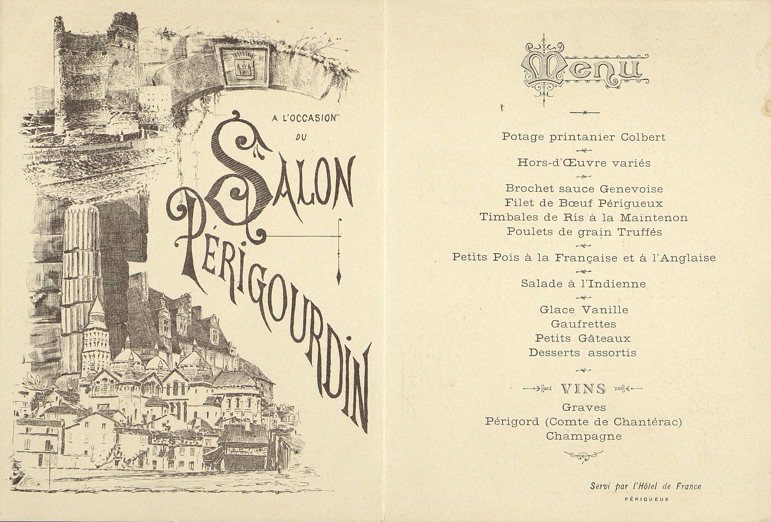 Menu : Plats servis : Potage printanier Colbert. Hors-d’œuvre variés. Brochet sauce Genevoise. Filet de bœuf Périgueux.Timbale de Ris à la Maintenon. Poulet de grain truffés.