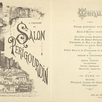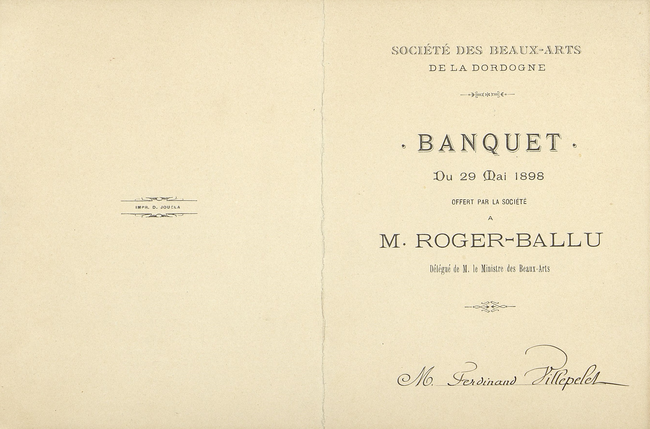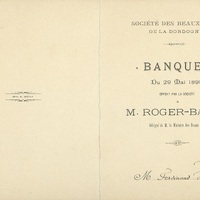 Menu sur dépliant du Banquet de la Société des Beaux-Arts du 29 mai 1898, offert à M. Roger-Ballu, délégué de M. le Ministre des Beaux-Arts... A l'occasion du Salon Périgourdin. Menu attribué à M Ferdinand Villeplet .