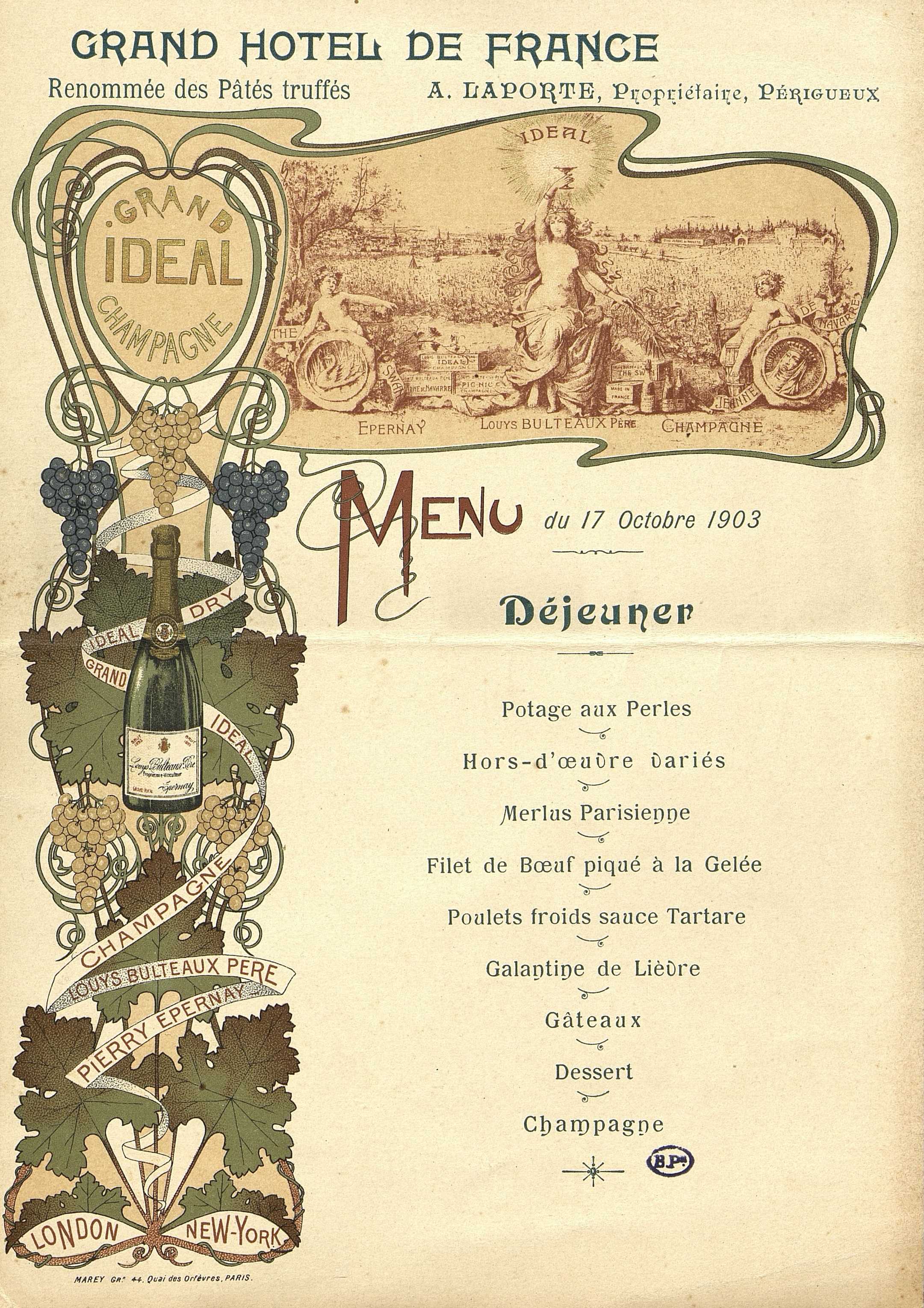 Menu du 17 octobre 1903 du Grand Hôtel de France.